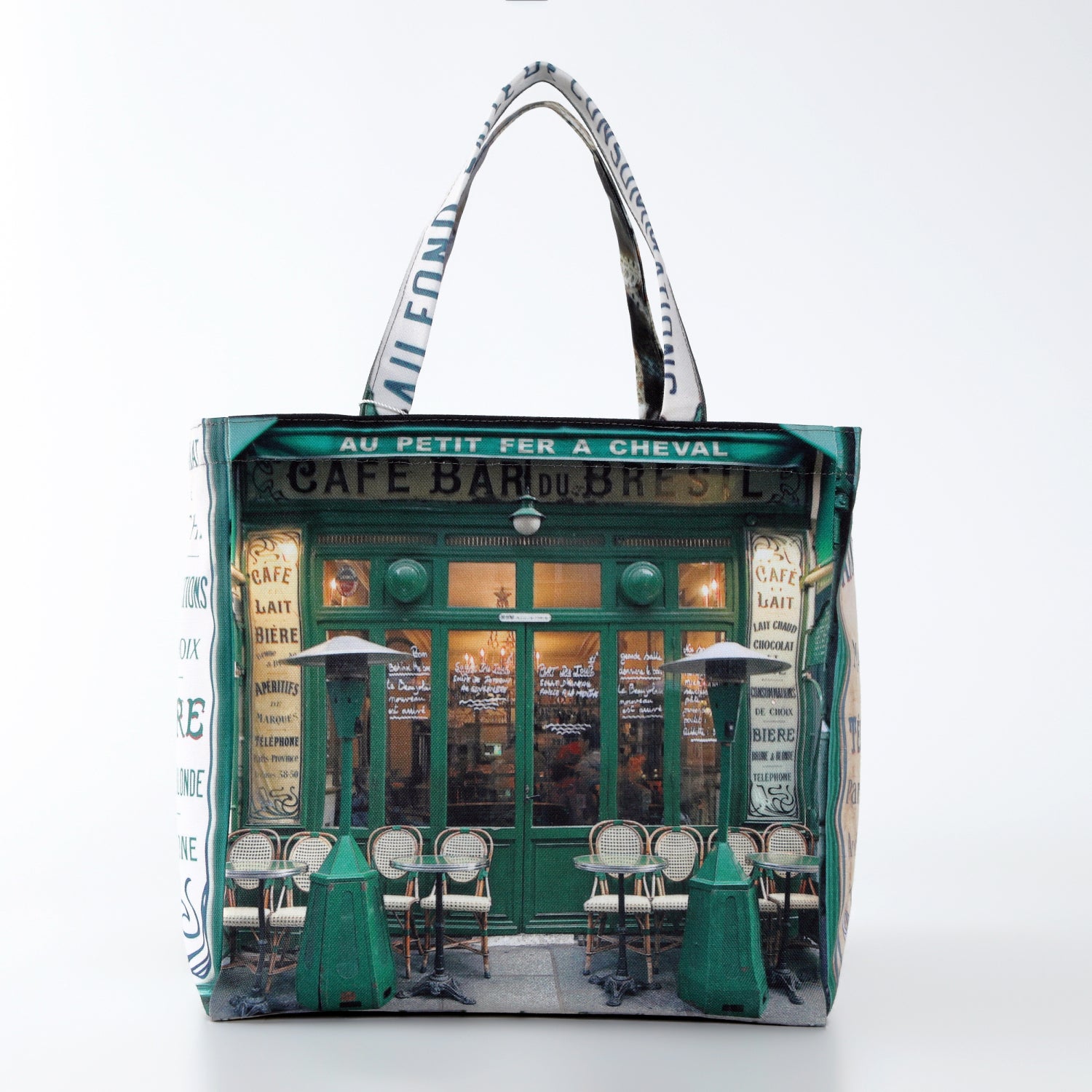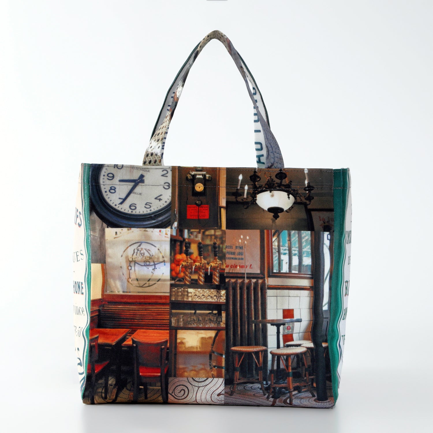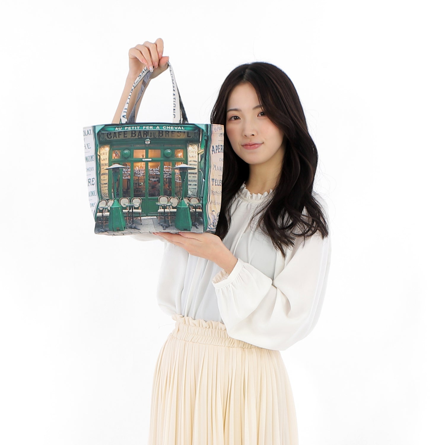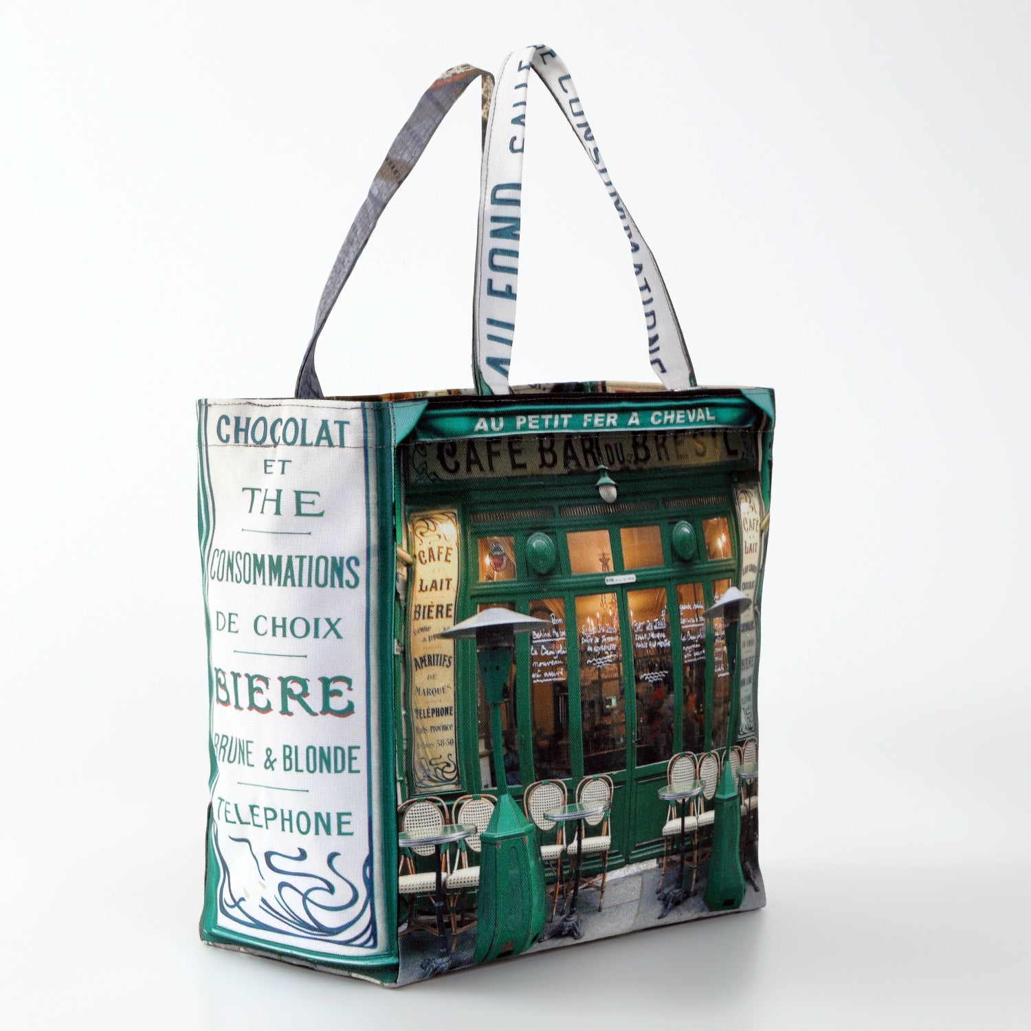 パリでも有名な老舗カフェ「Au p'tit fer a cheval」の外観がプリントされたバッグは、後ろ面は店内の様子の写真がコラージュされており、落ち着いた店内の雰囲気が感じられます。また、底面には石畳がプリントされており、まるでそのお店に行ったかのような雰囲気を味わえます。
