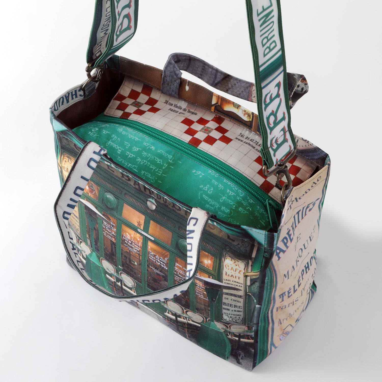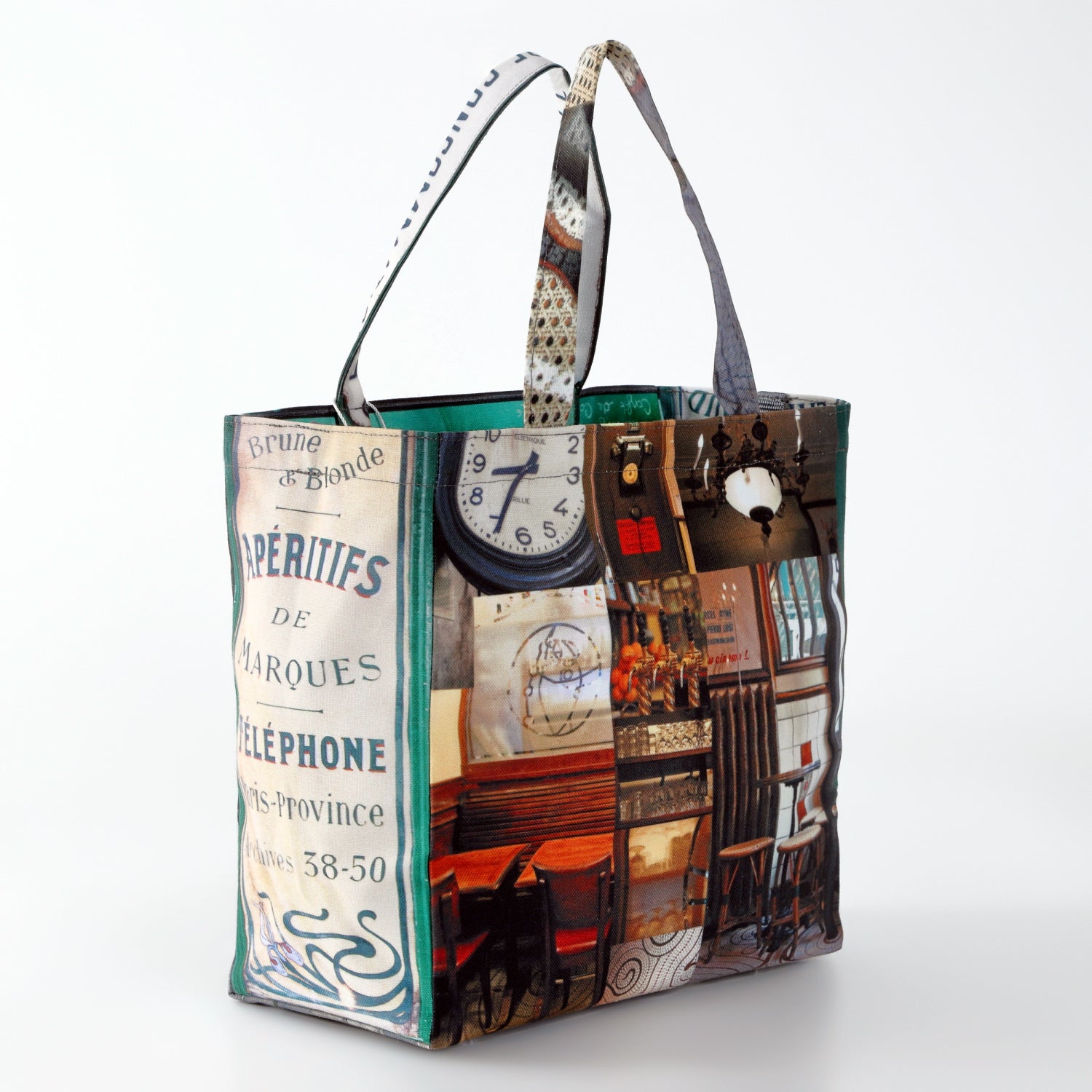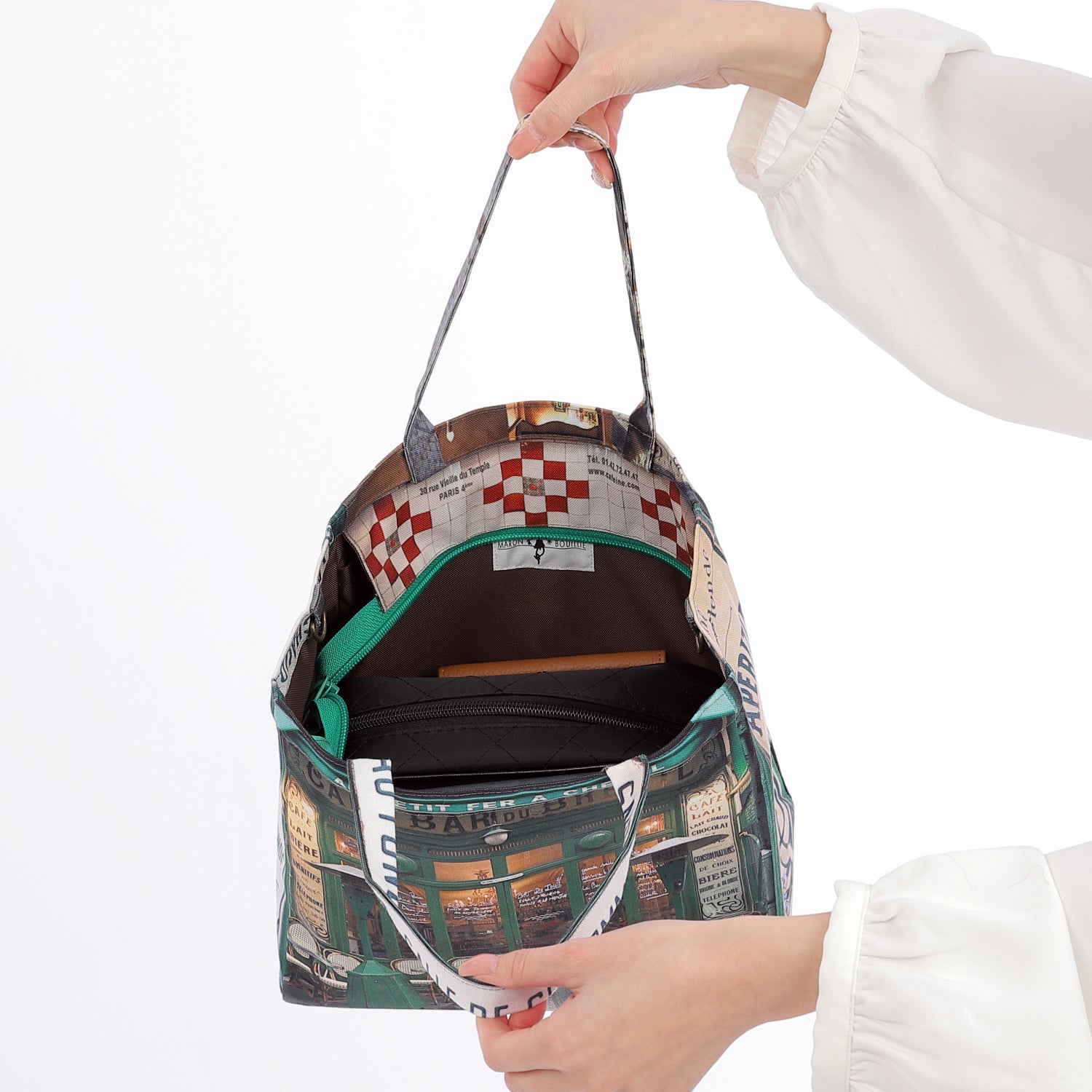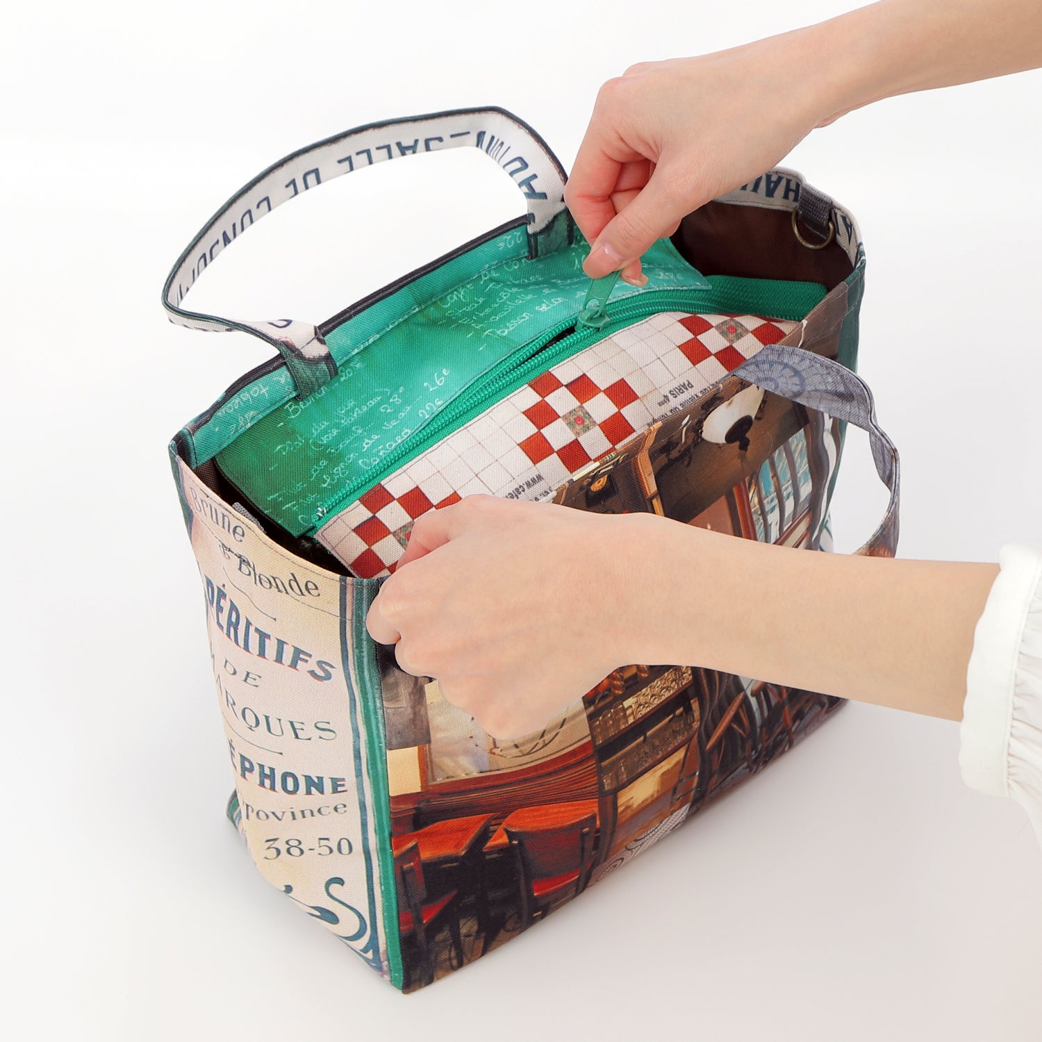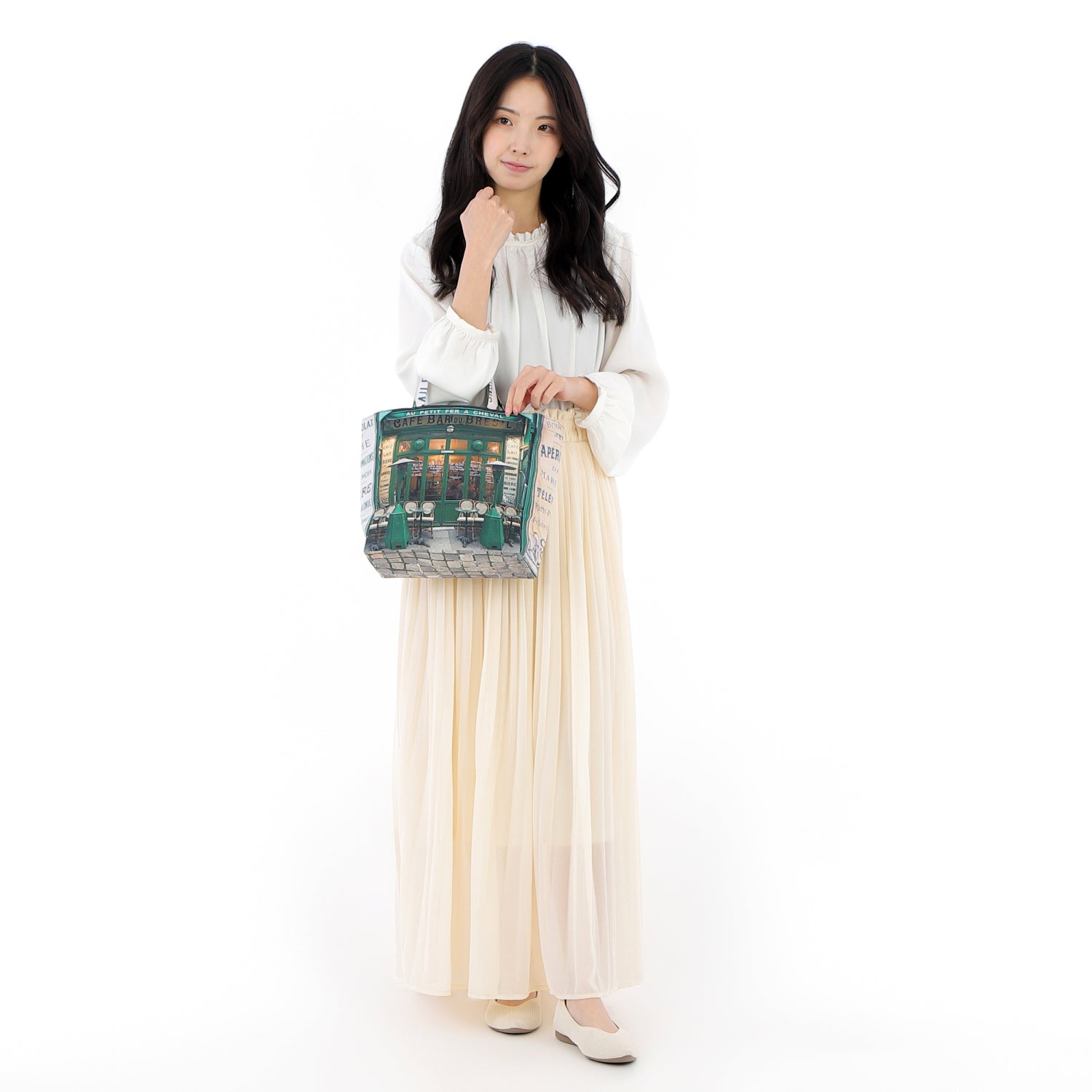 パリでも有名な老舗カフェ「Au p'tit fer a cheval」の外観がプリントされたバッグは、後ろ面は店内の様子の写真がコラージュされており、落ち着いた店内の雰囲気が感じられます。また、底面には石畳がプリントされており、まるでそのお店に行ったかのような雰囲気を味わえます。