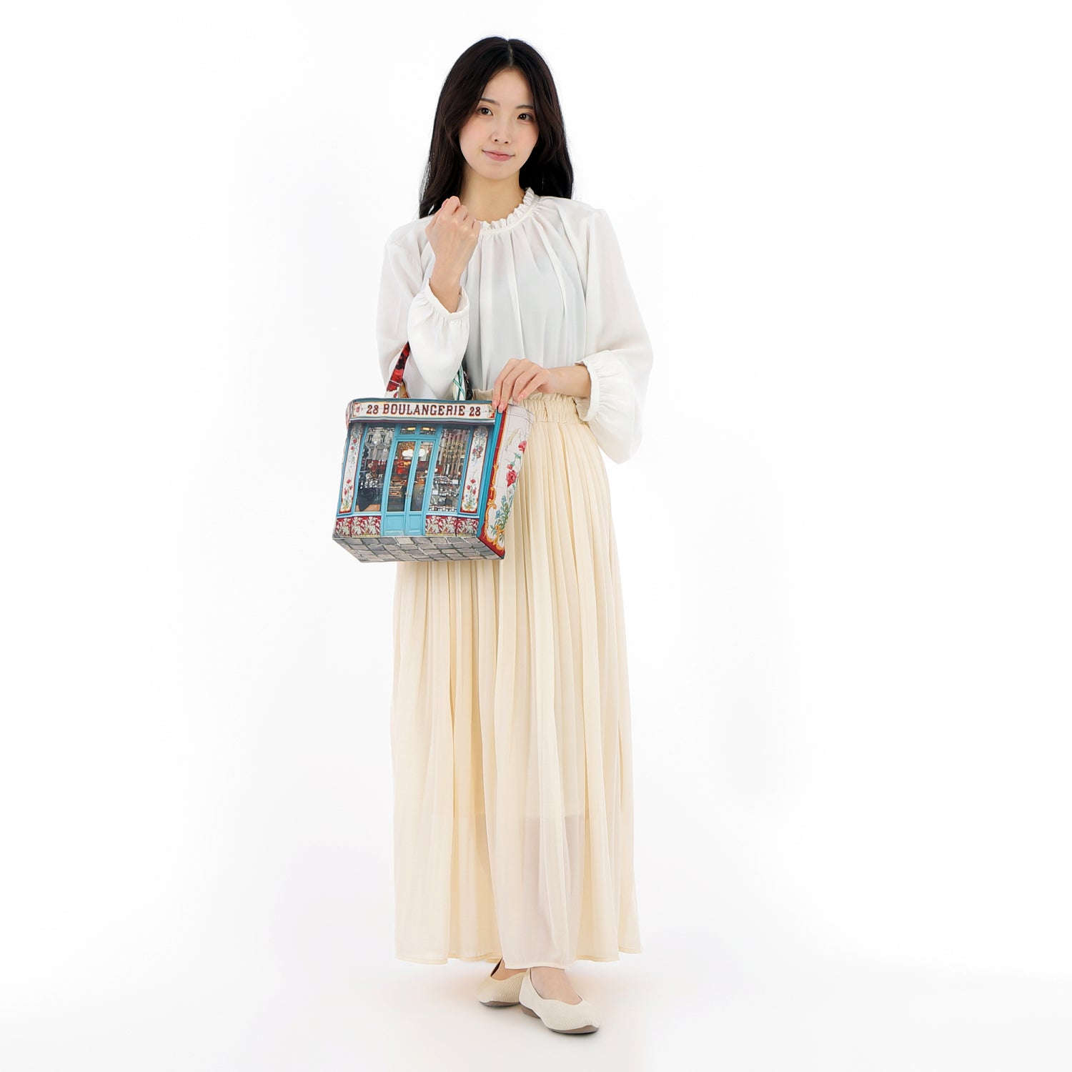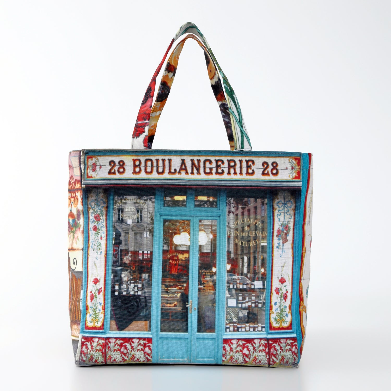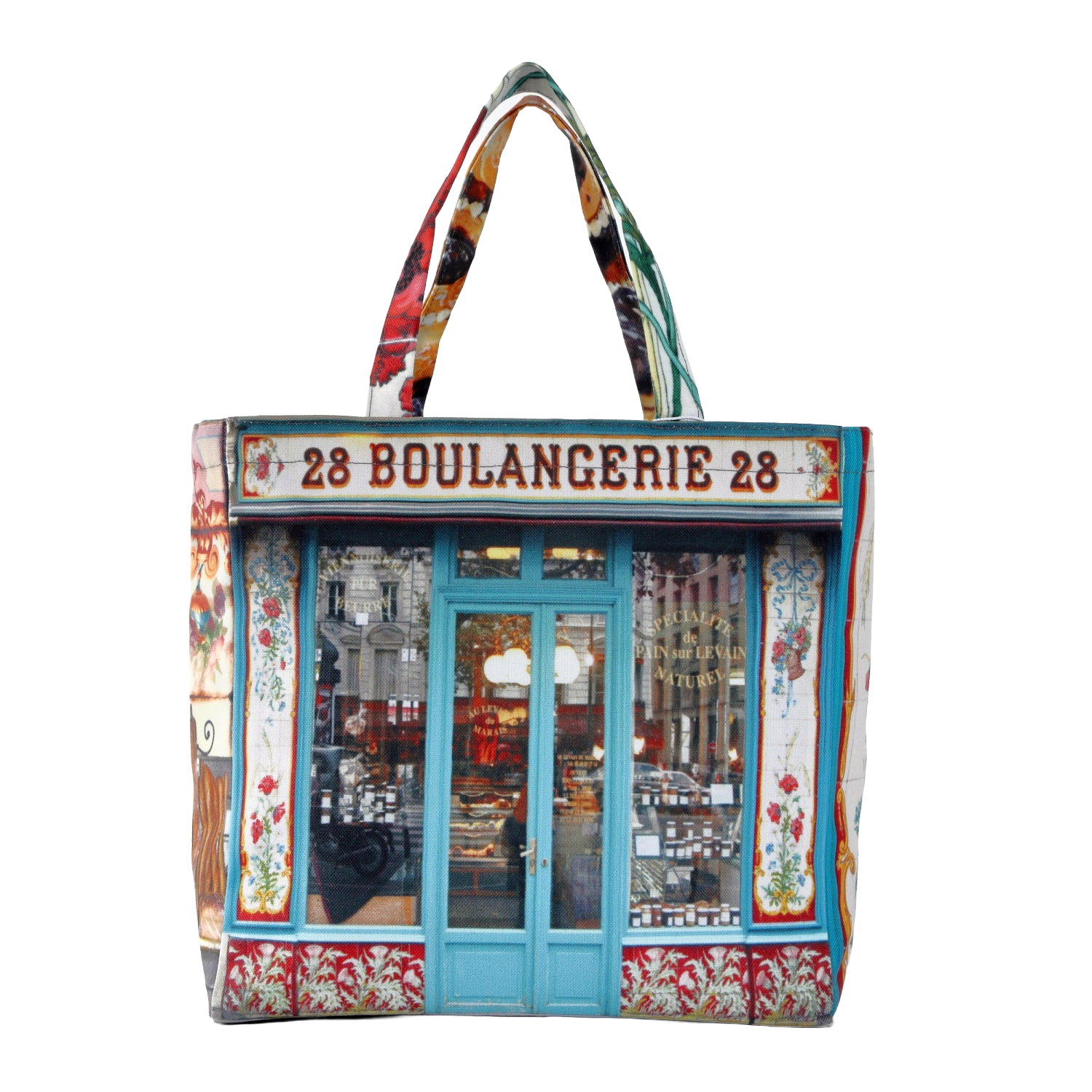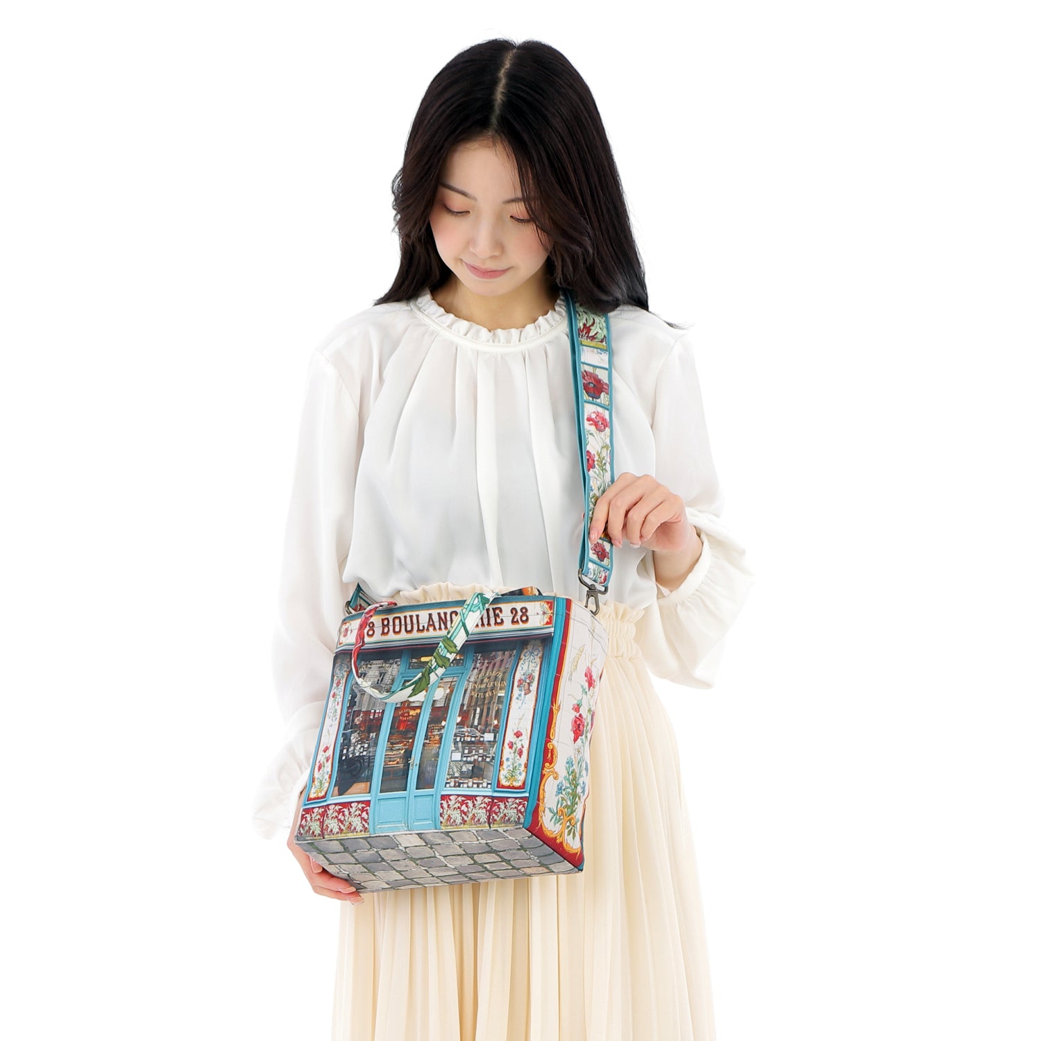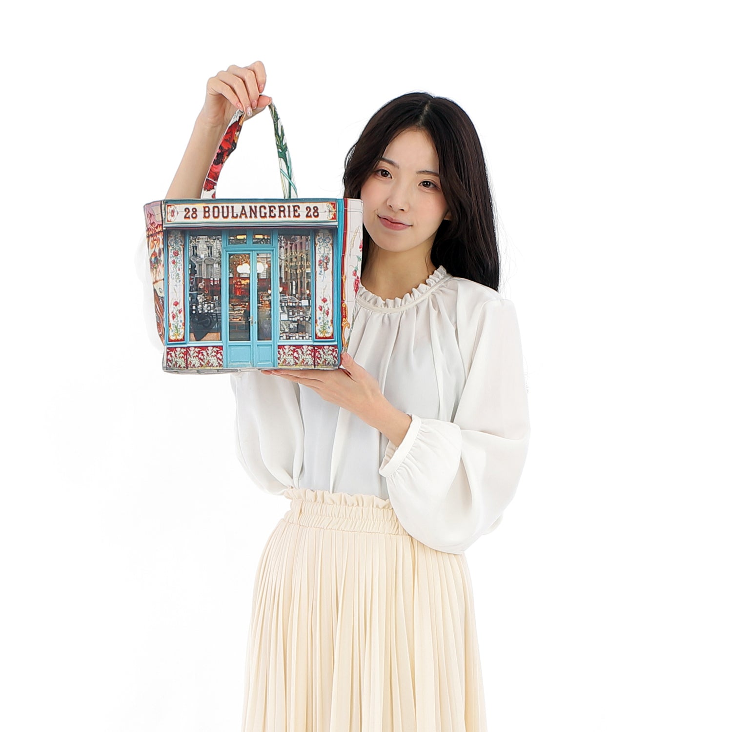 パリにある老舗のパン屋「Boulangerie 28」の外観がプリントされたバッグ。ターコイズブルーのカラーは落ち着いた雰囲気を演出しており、様々なシーンでも使える人気のカラーです。