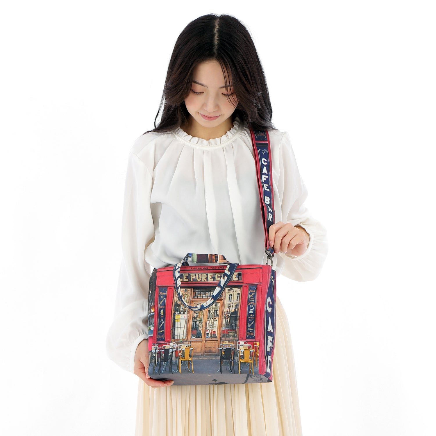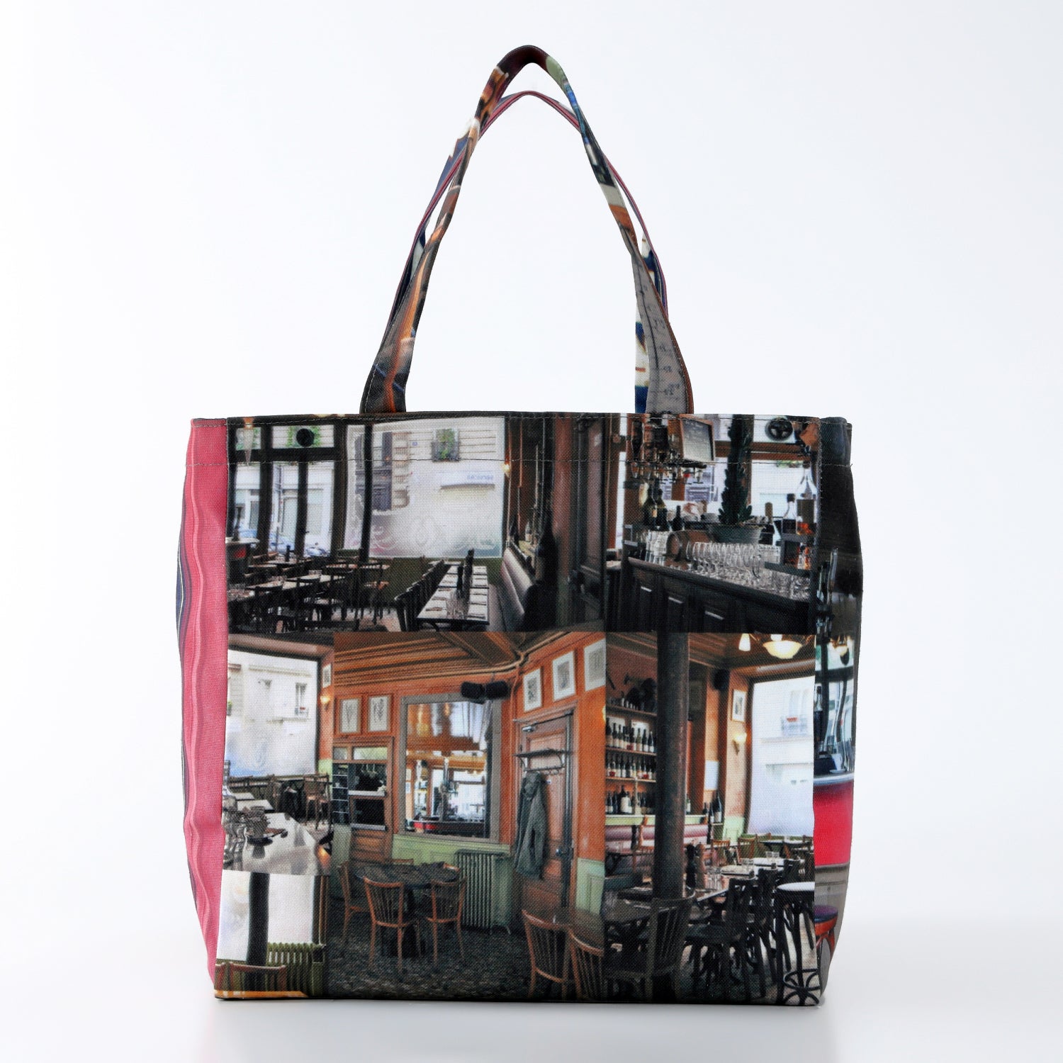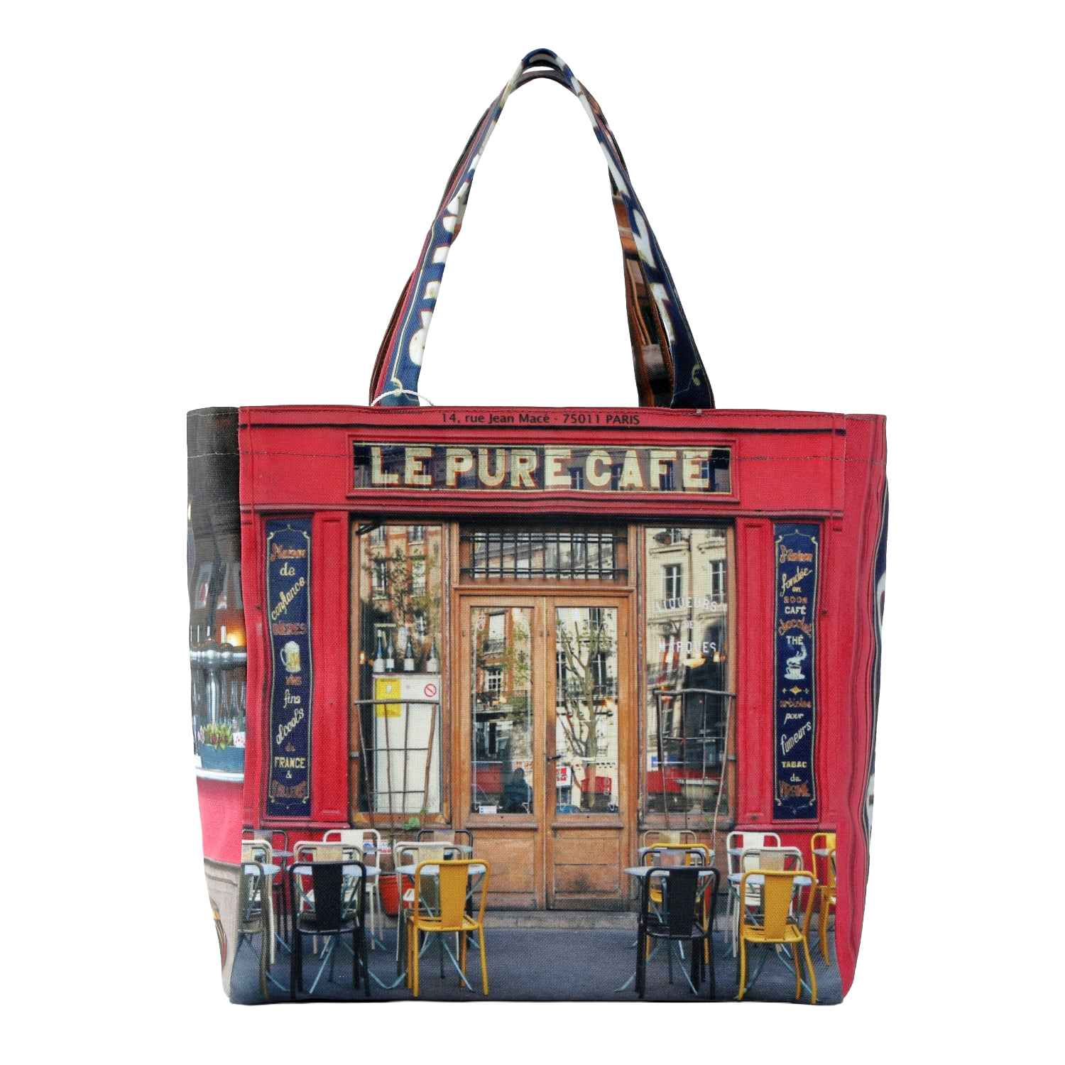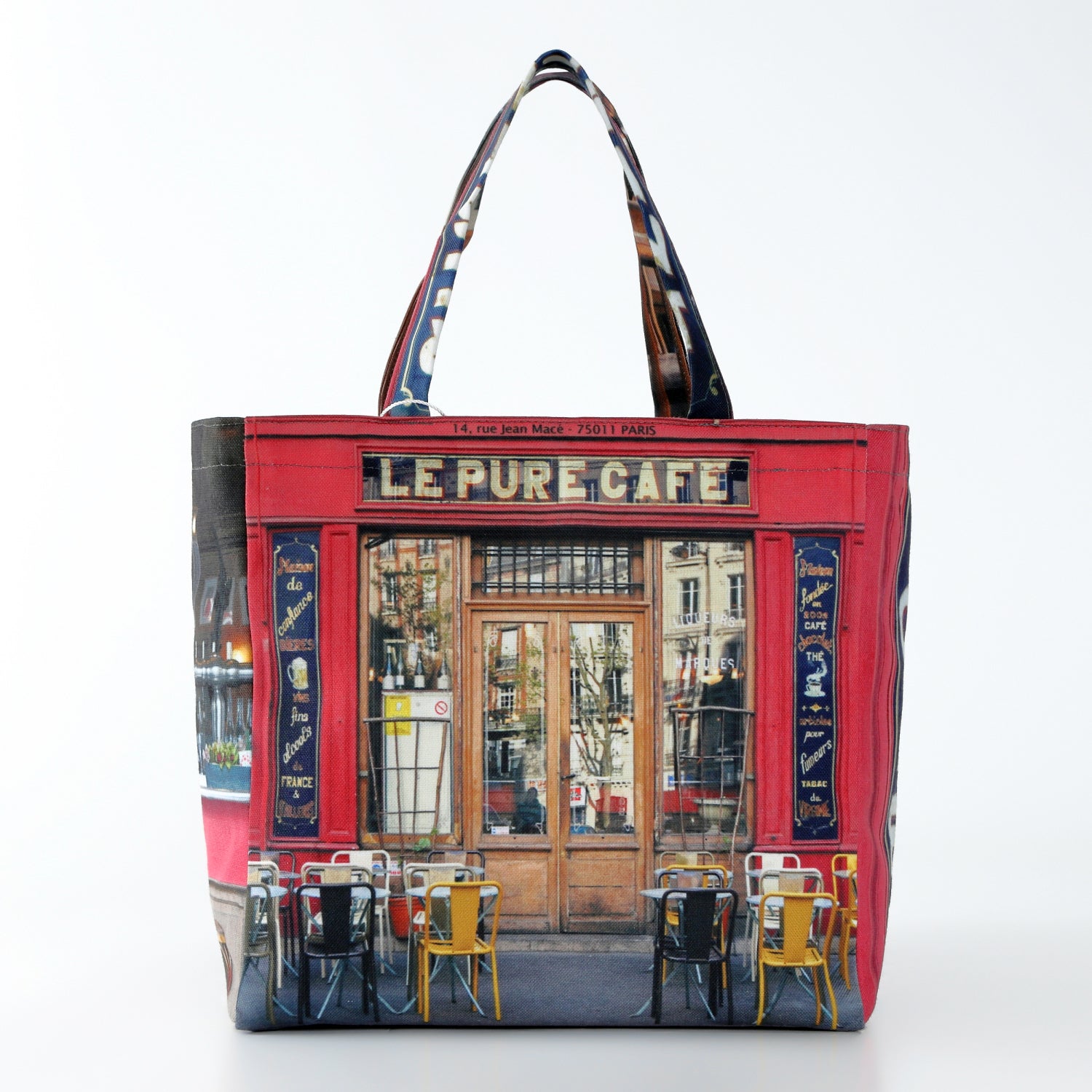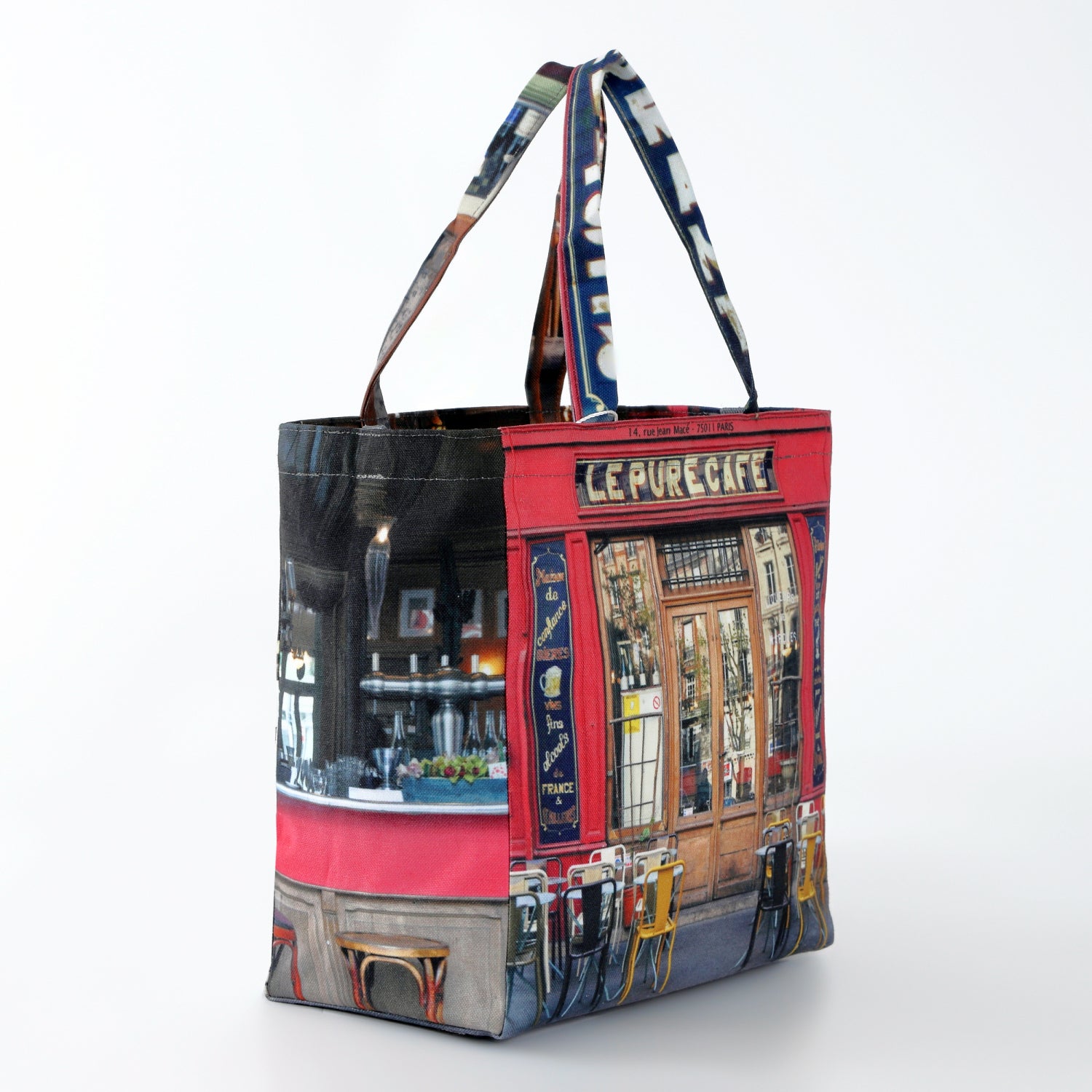 パリ11区にある老舗カフェ「Le pure cafe」の外観がプリントされたバッグ。映画の撮影でも使われた素敵な雰囲気の店内がバッグの後ろ面にプリントされています。