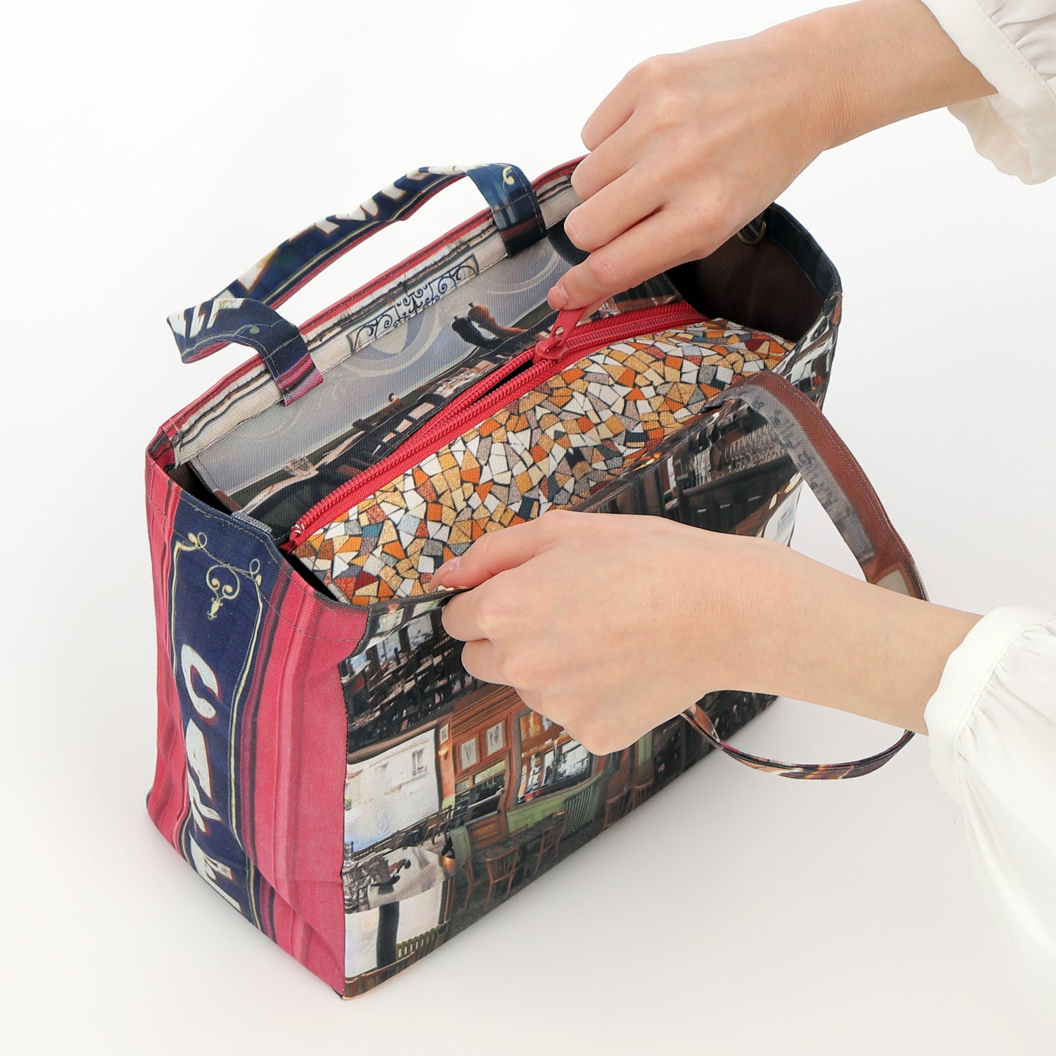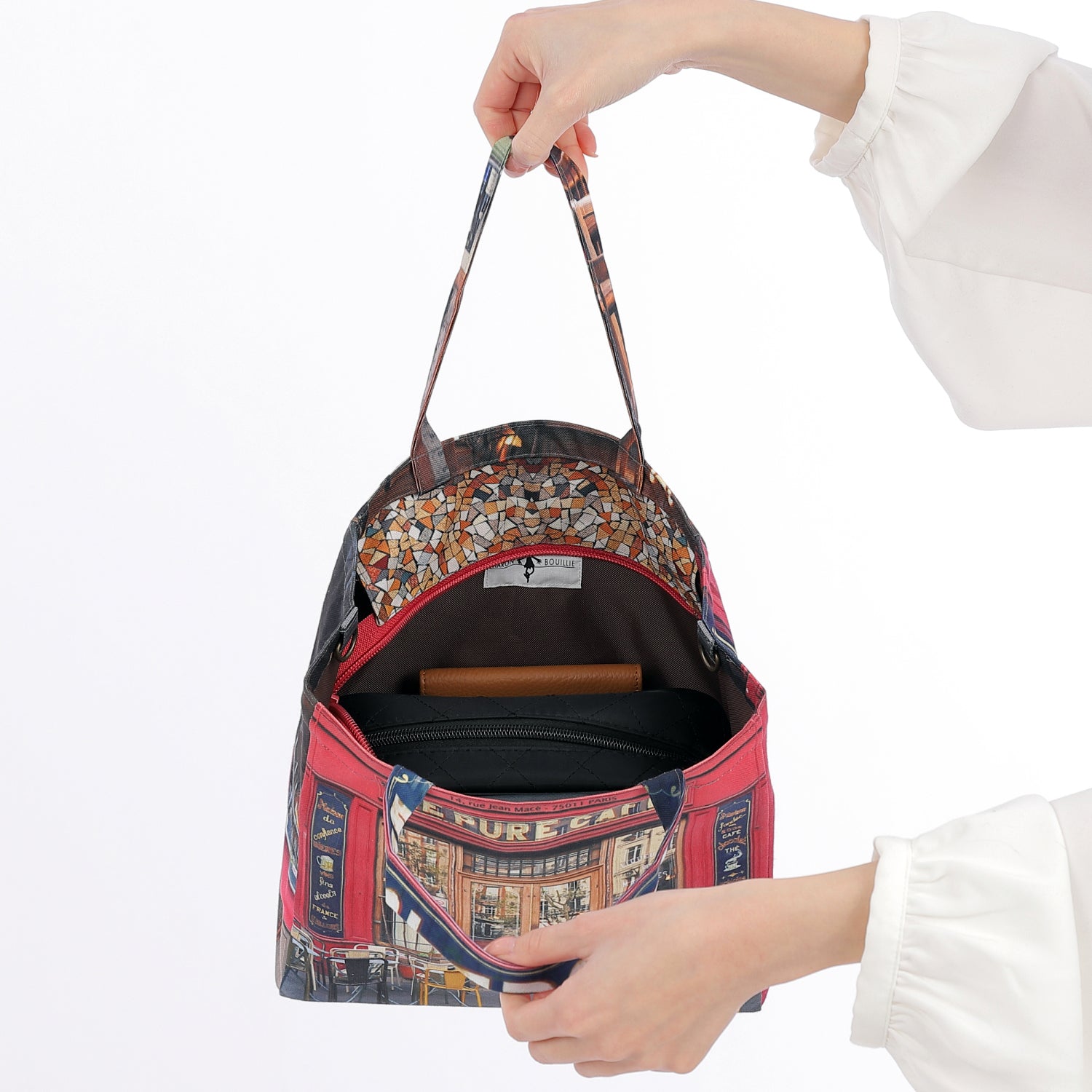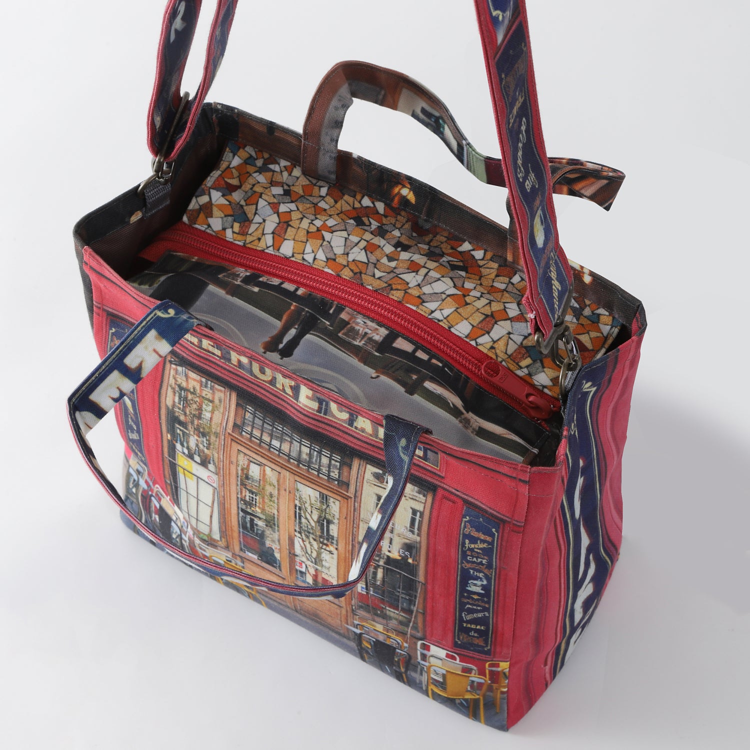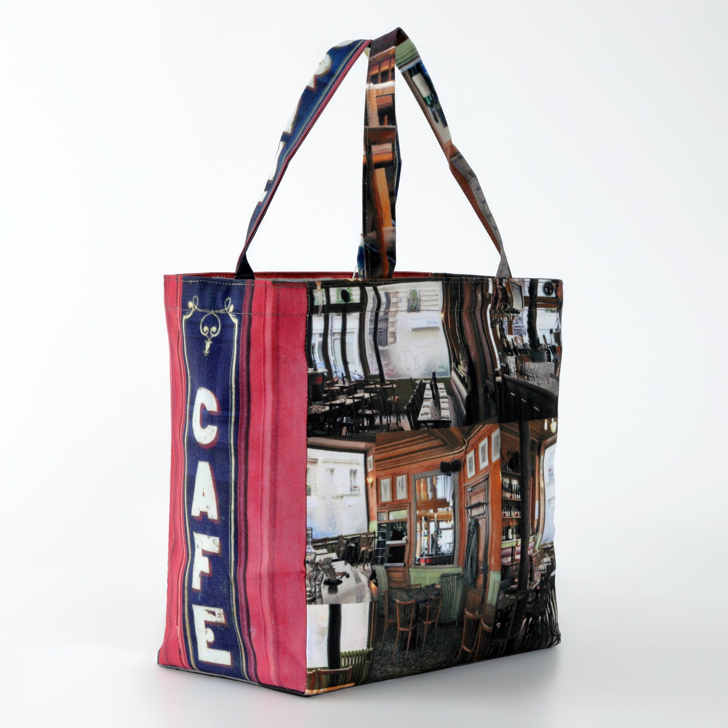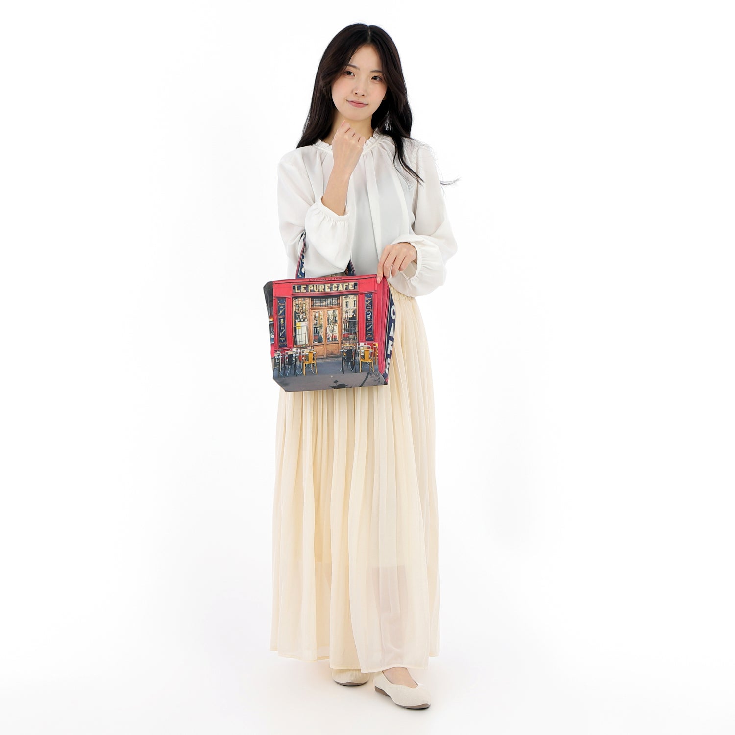 パリ11区にある老舗カフェ「Le pure cafe」の外観がプリントされたバッグ。映画の撮影でも使われた素敵な雰囲気の店内がバッグの後ろ面にプリントされています。