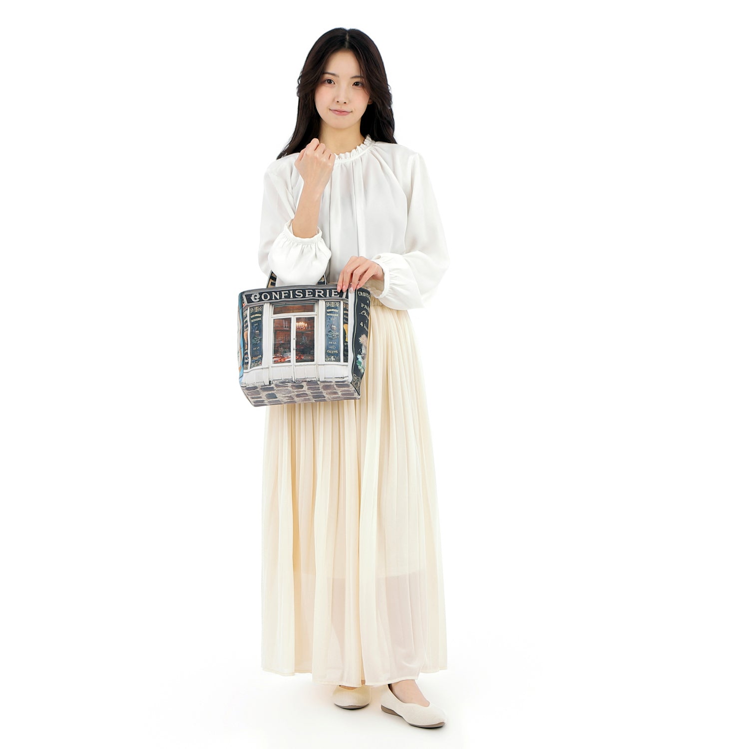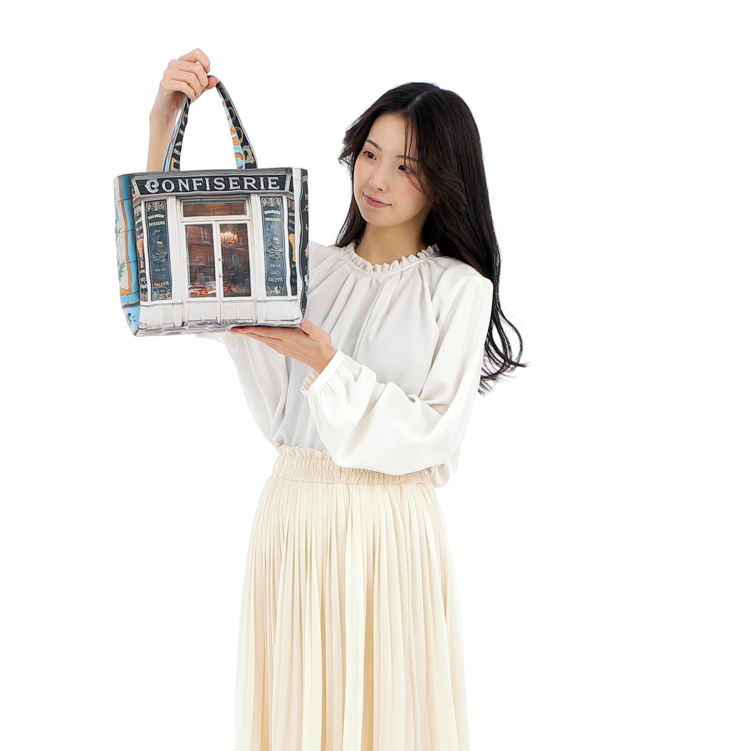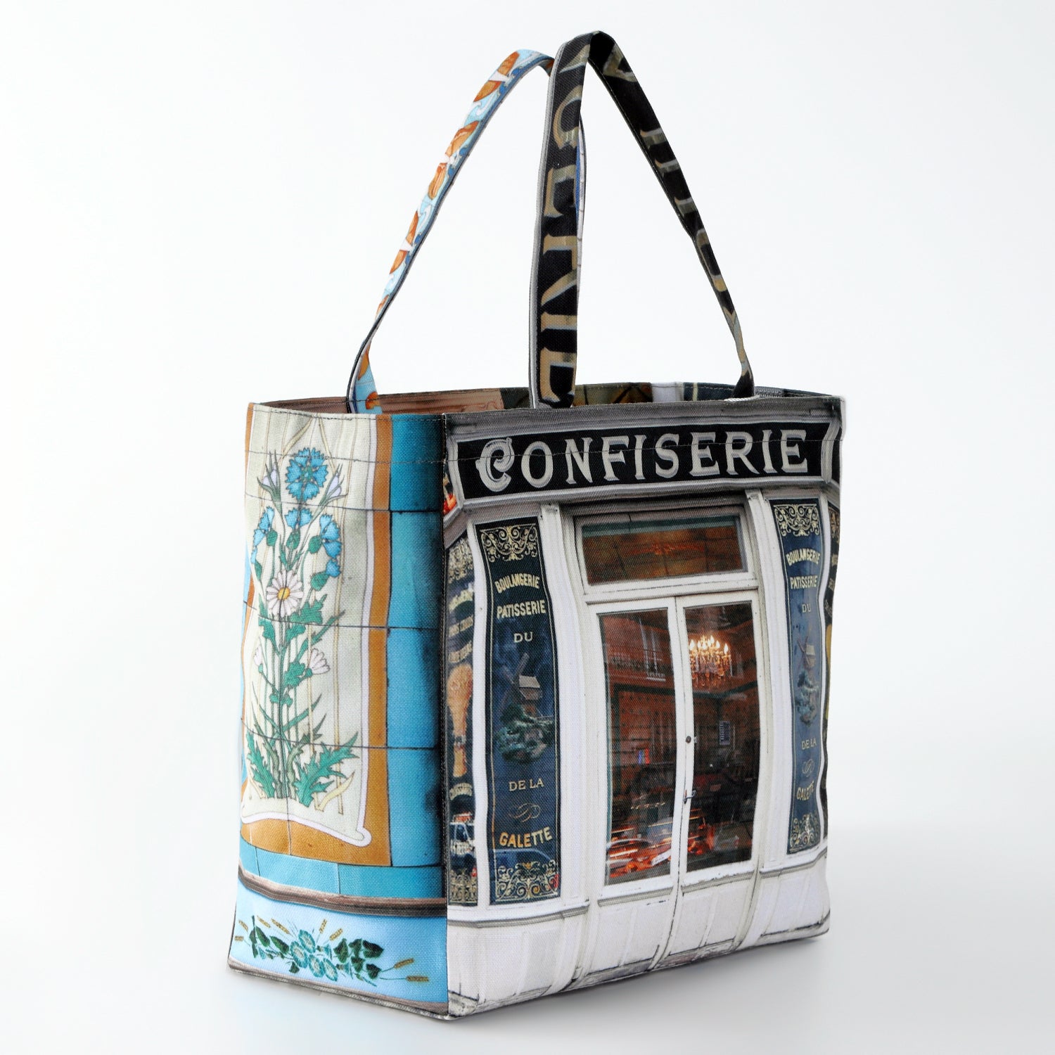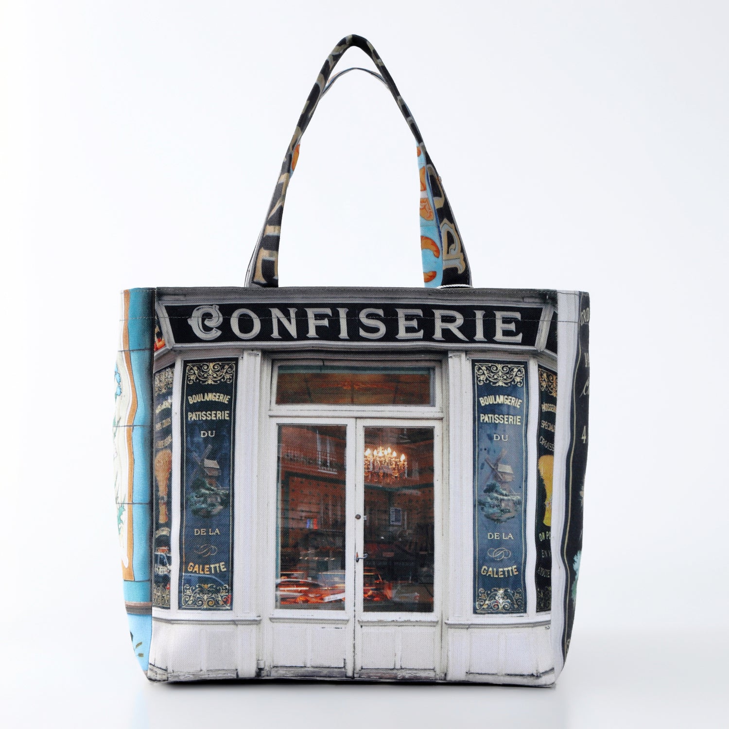 モンマルトルの丘の近くにある、観光客に大変人気の老舗お菓子屋の外観がプリントされたバッグ。外観の美しさが目を惹きますが、店内の素晴らしい雰囲気の様子もバッグの後ろ面にプリントされています。