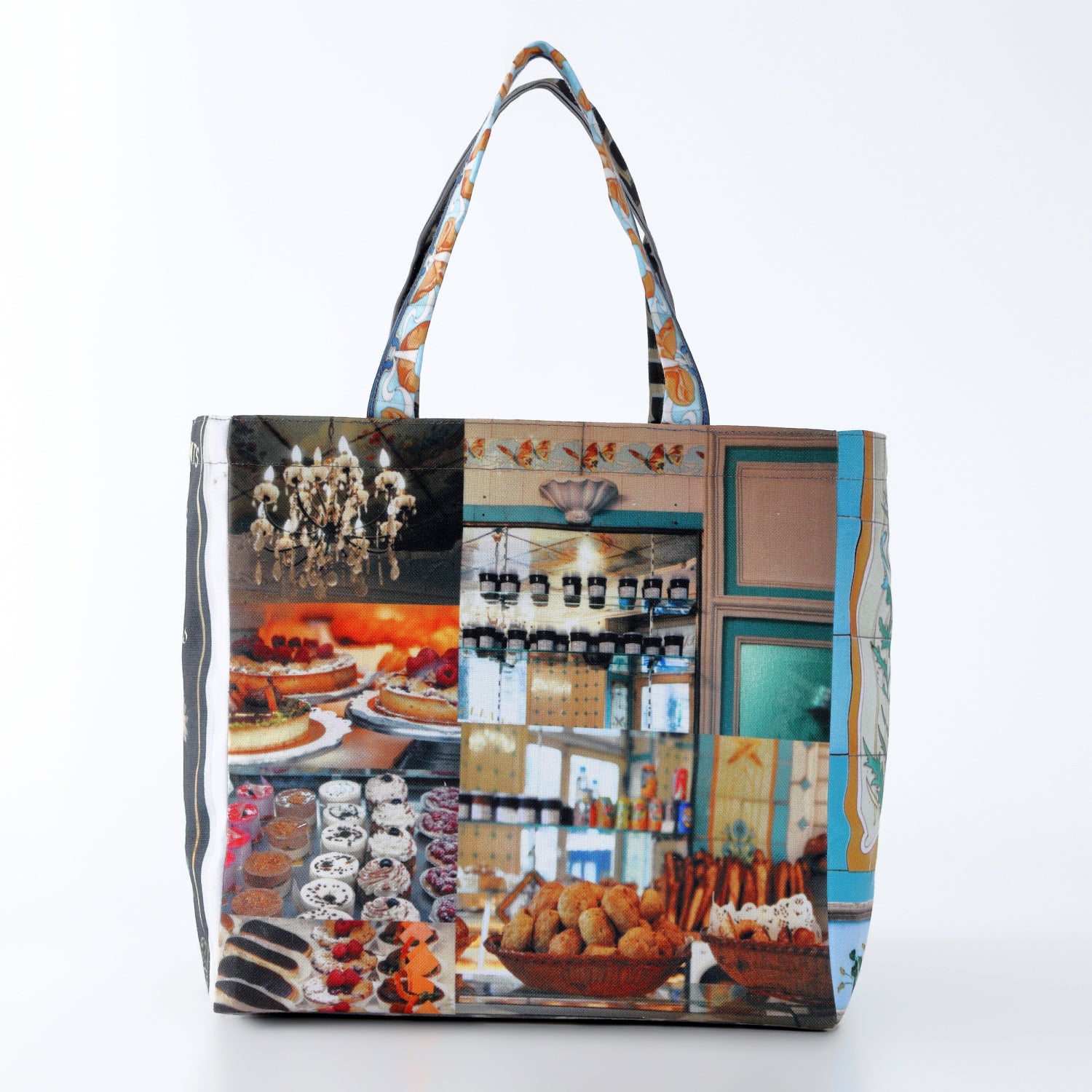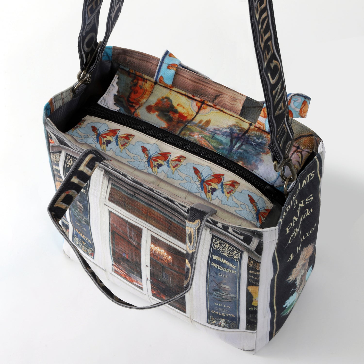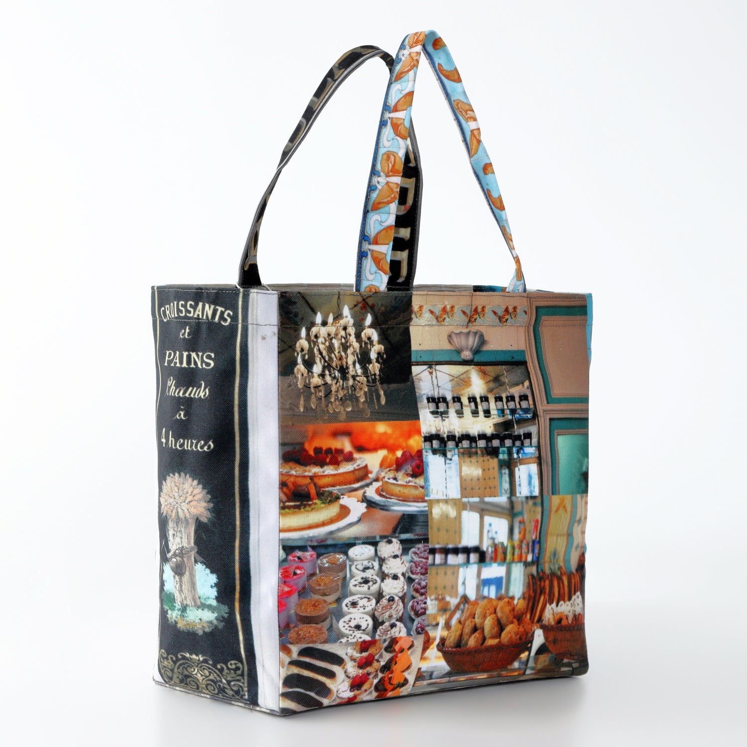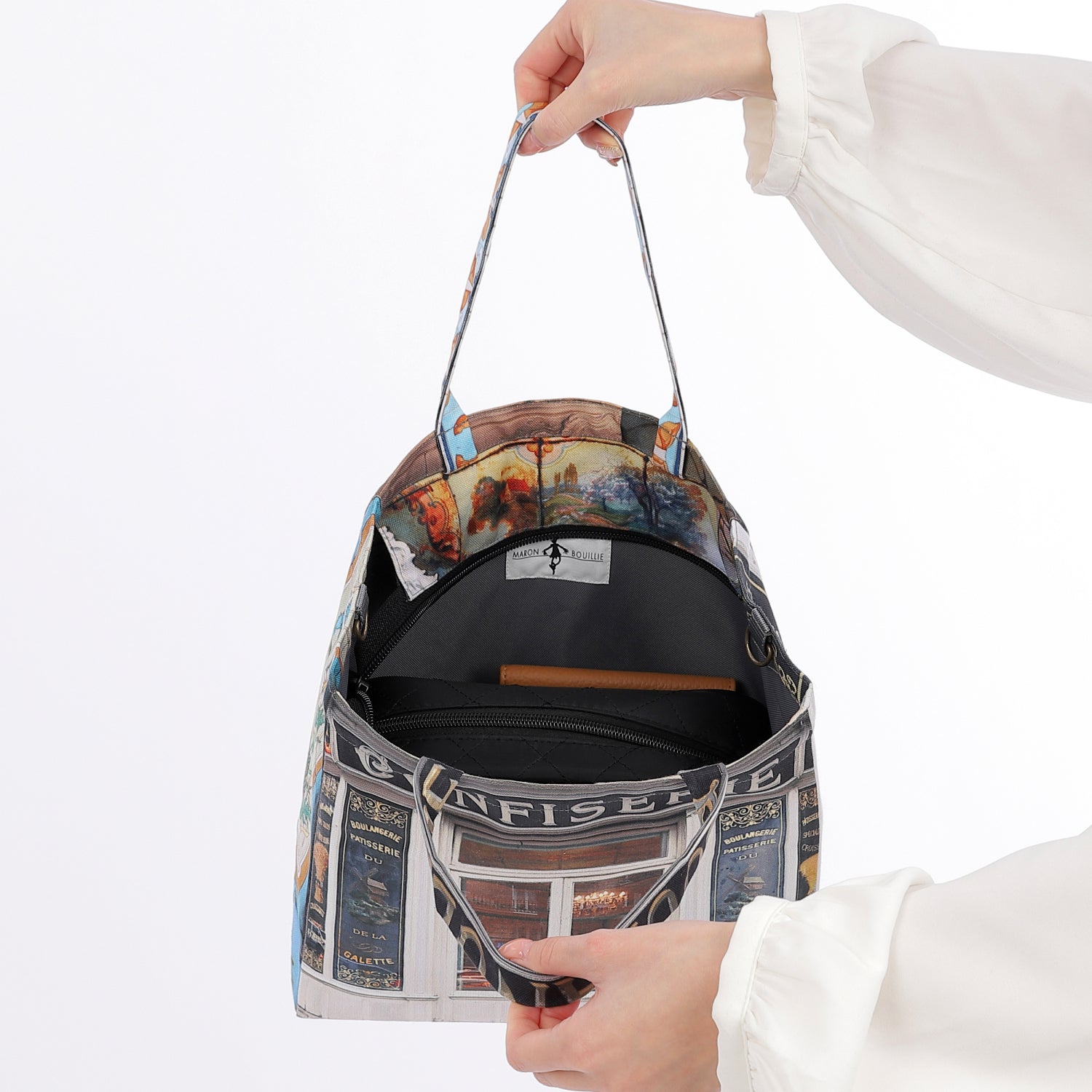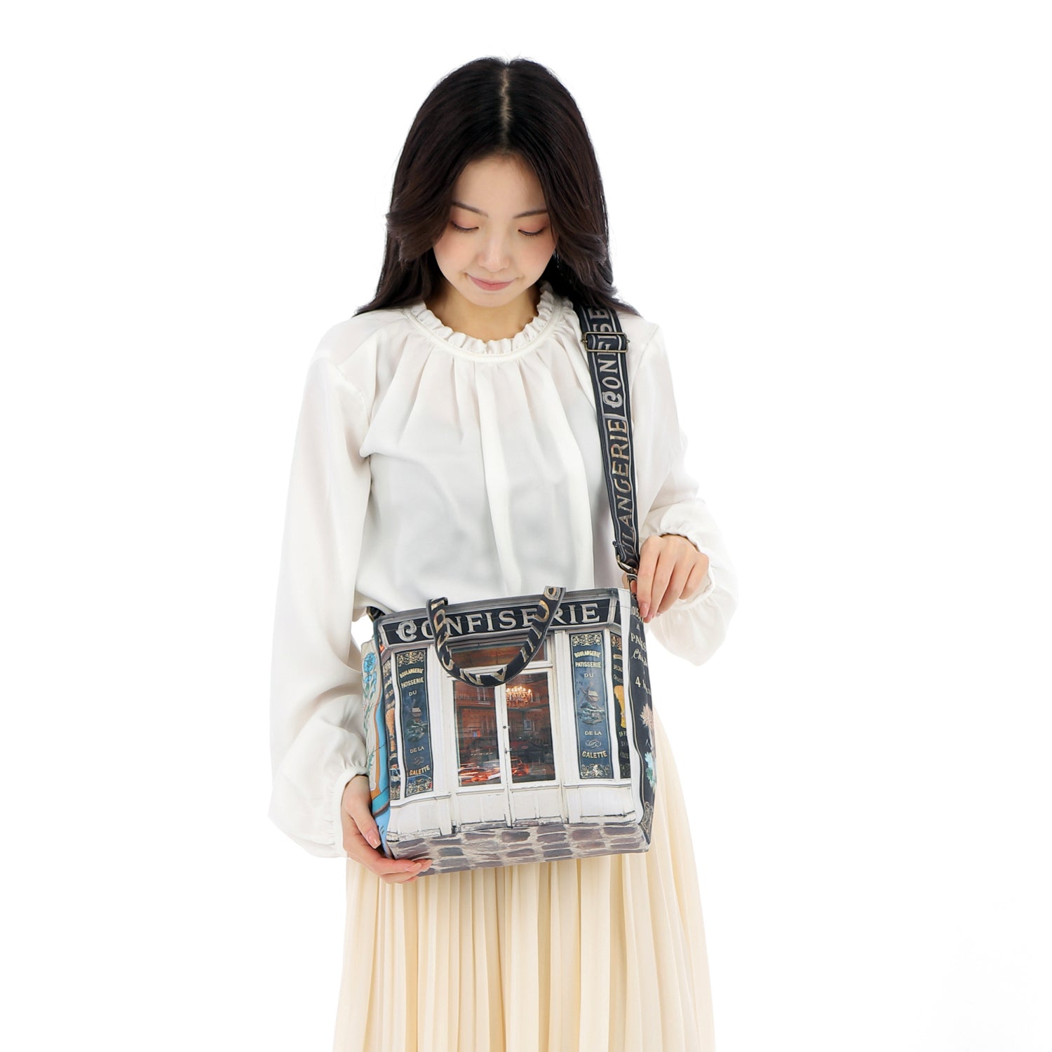 モンマルトルの丘の近くにある、観光客に大変人気の老舗お菓子屋の外観がプリントされたバッグ。外観の美しさが目を惹きますが、店内の素晴らしい雰囲気の様子もバッグの後ろ面にプリントされています。