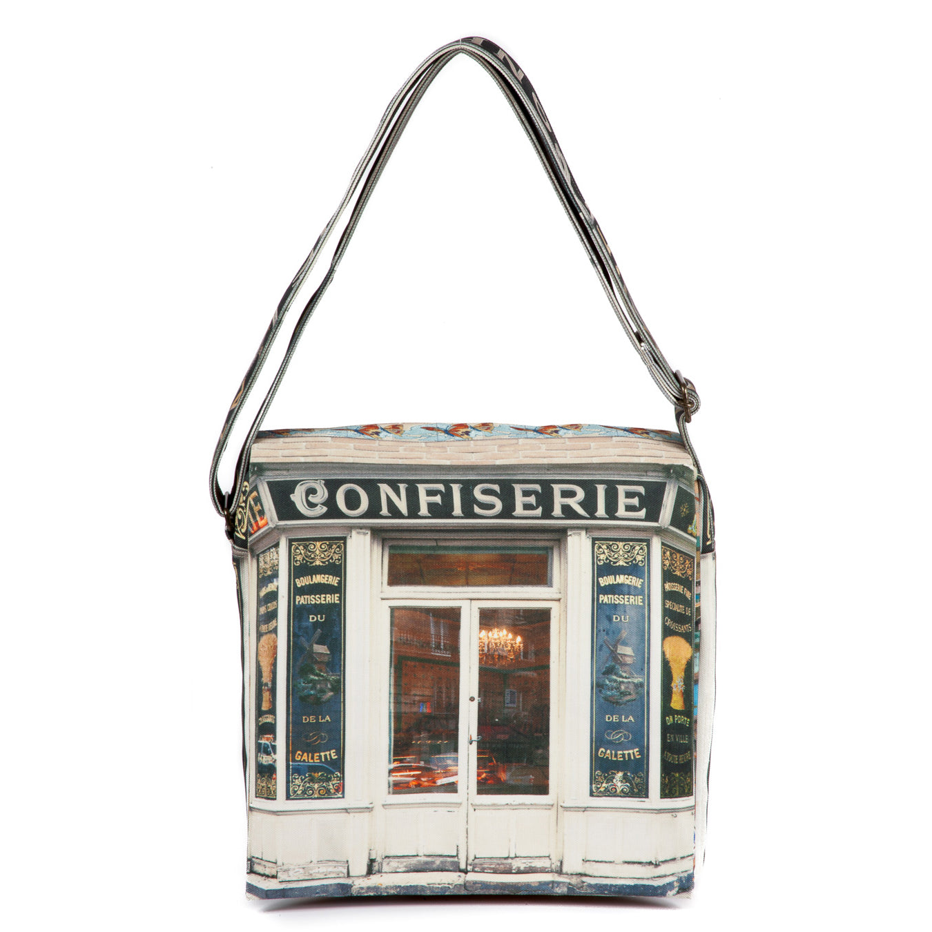 Confiserie(コンフィズリ)は、パリに実在する有名なパン屋さん。黒にゴールドの店名が印象的な店構えや、店内のシャンデリアや美しい店内装飾を写真に撮ってコラージュし、バッグの全面やフラップの内側、幅広の持ち手にもプリントした、おしゃれなショルダーバッグです。