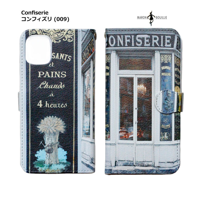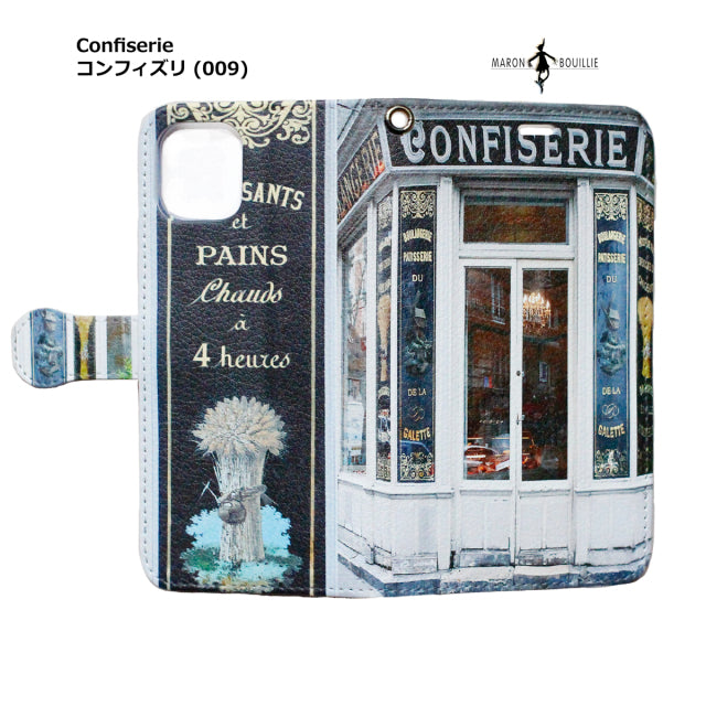 iPhone11用手帳型スマホケース。皮の風合いの押し型を施した合皮製。縁はステッチをで仕上げた手帳型のスマートフォンカバーです。フランス人デザイナーブランド、マロン・ブイー。パリに実在する美しいレトロなお店をデザインした「パリレトロ」コレクションから7つのお店のデザイン。内側にカードを入れるスリット。裏面は、スマホスタンドとして使えるよう折り目加工あり。日本製