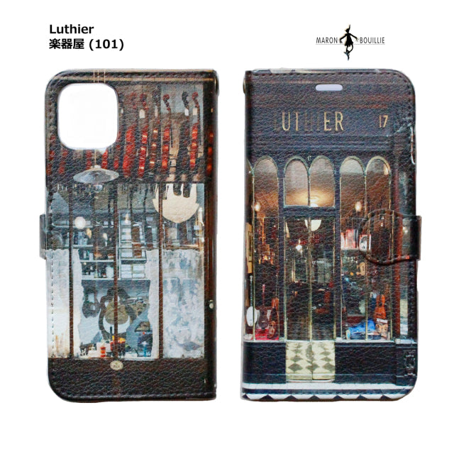 iPhone11用手帳型スマホケース。皮の風合いの押し型を施した合皮製。縁はステッチをで仕上げた手帳型のスマートフォンカバーです。フランス人デザイナーブランド、マロン・ブイー。パリに実在する美しいレトロなお店をデザインした「パリレトロ」コレクションから7つのお店のデザイン。内側にカードを入れるスリット。裏面は、スマホスタンドとして使えるよう折り目加工あり。日本製