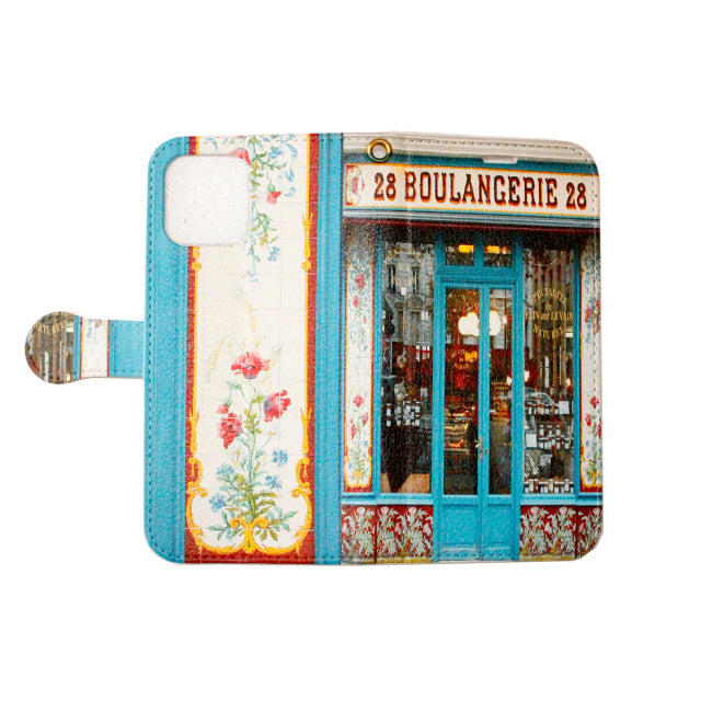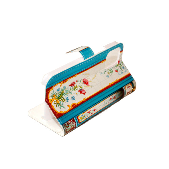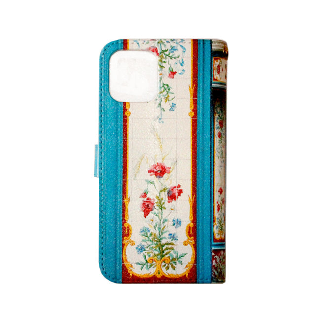 iPhone13用のスマホケース。パチッとはめれば、カメラの位置もぴったり。そのまま写真撮影もできてとても便利です。素材は、皮の風合いの押し型を施した合皮。縁はステッチ仕上げの、高級感のある手帳型のスマホケースです。高度な印刷技術で、オリジナル作品を細部まで再現した鮮やかな発色と緻密なデザイン。ほかにはない、マロン・ブイーオリジナルの、美しいスマホケースは目を惹くこと間違いなしです。