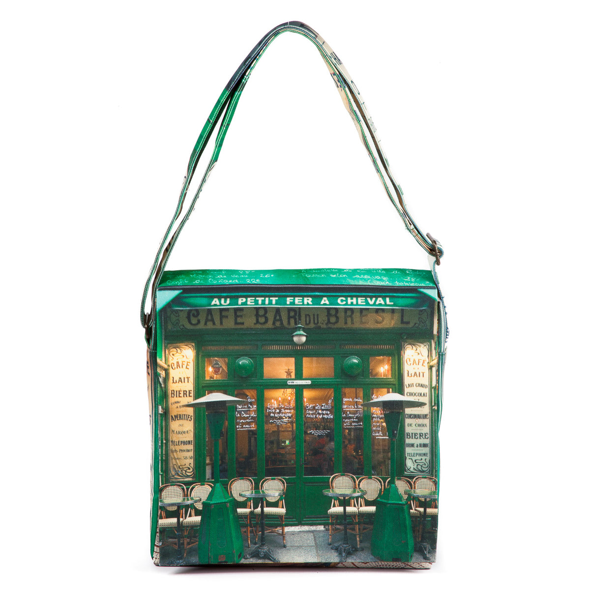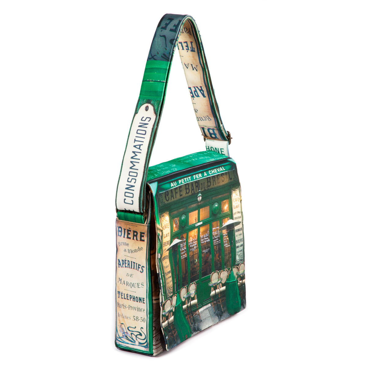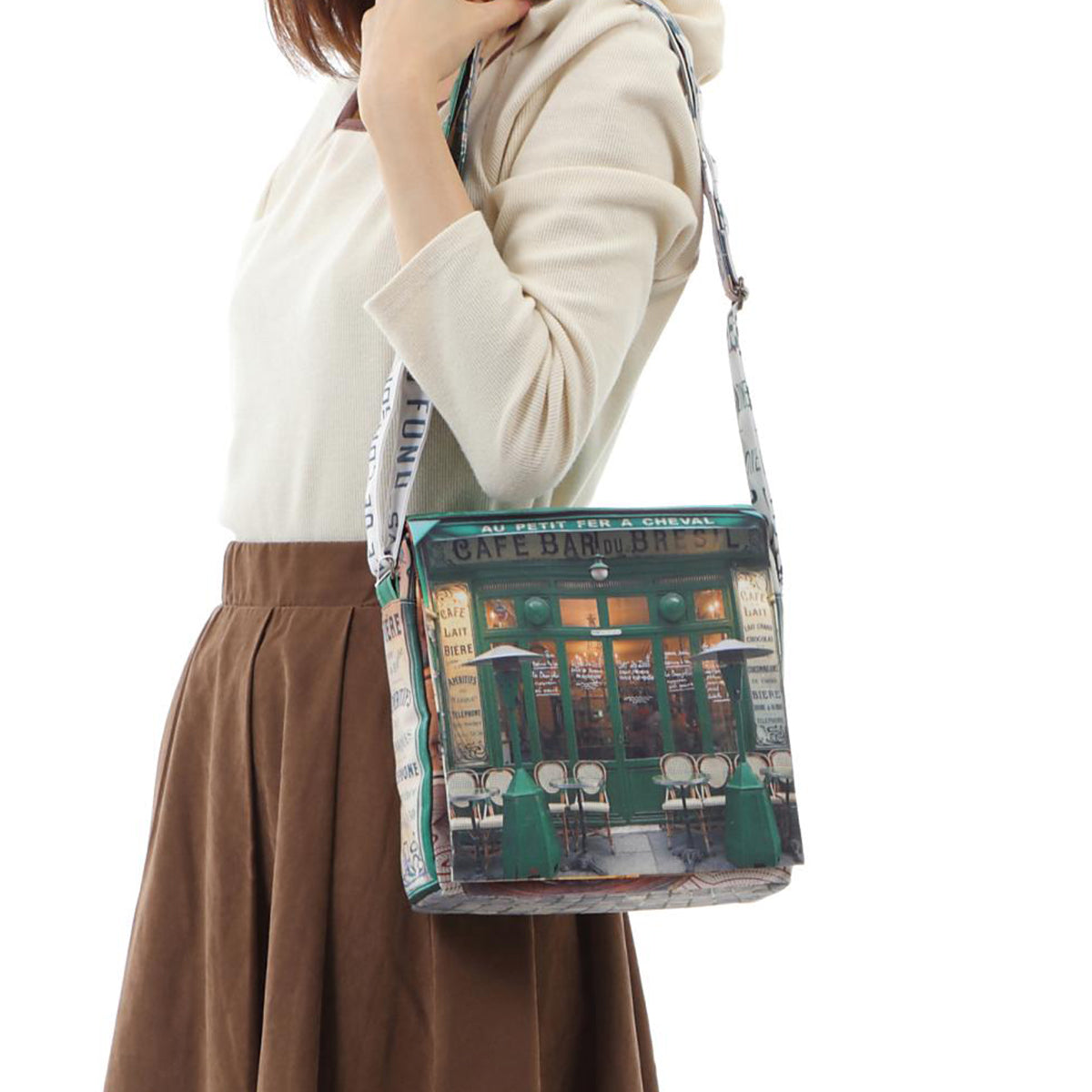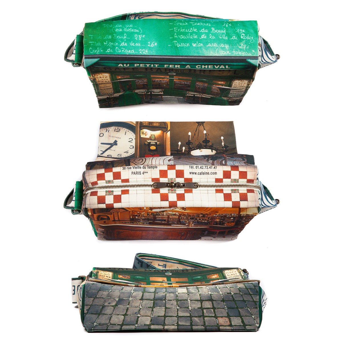 Au petit fer à cheval(プティフーアシュヴァル)は、パリに実在する老舗のカフェ。グリーンが印象的な店構えや、看板、店内をコラージュし、バッグの全面やフラップの内側、幅広の持ち手にもプリントした、おしゃれなショルダーバッグです。