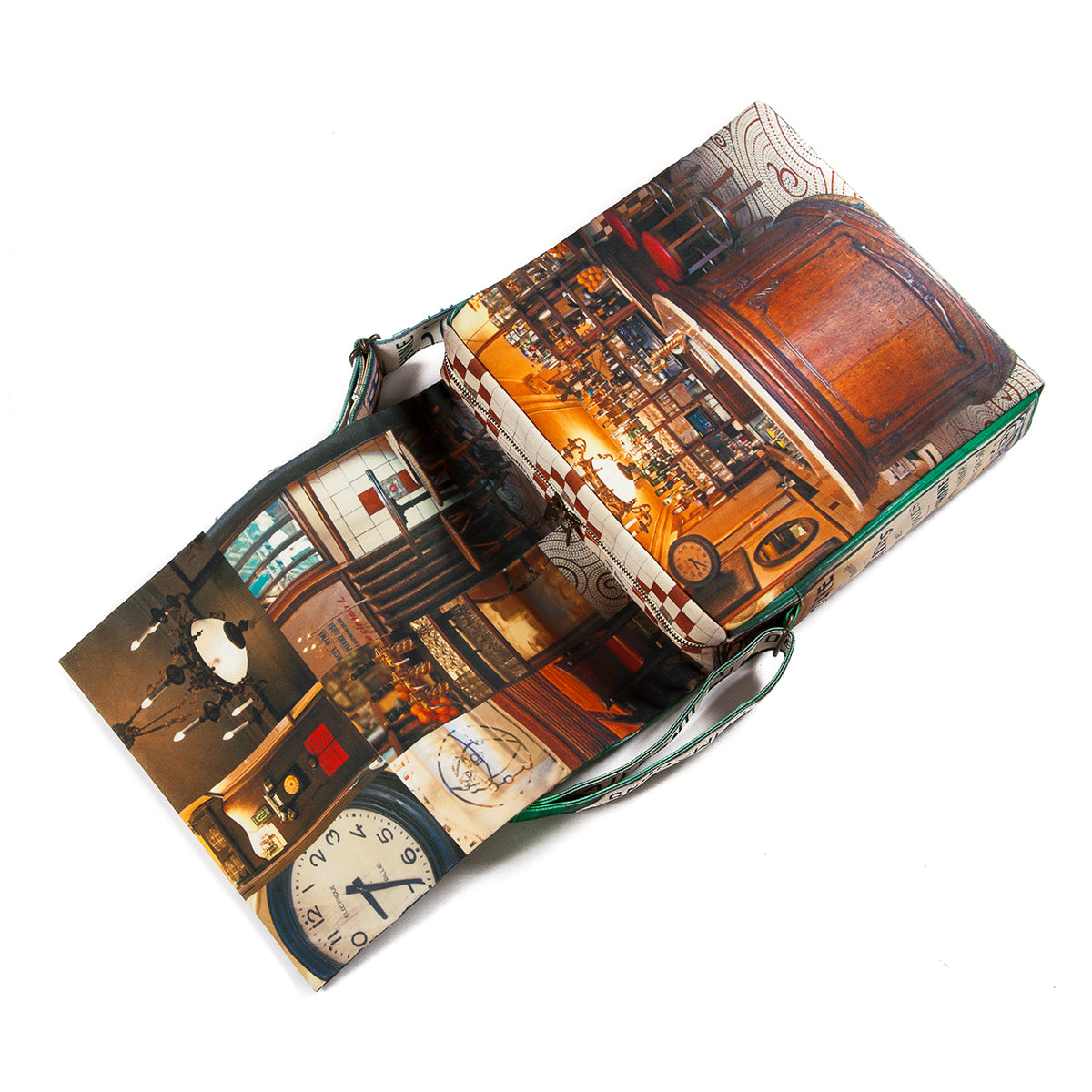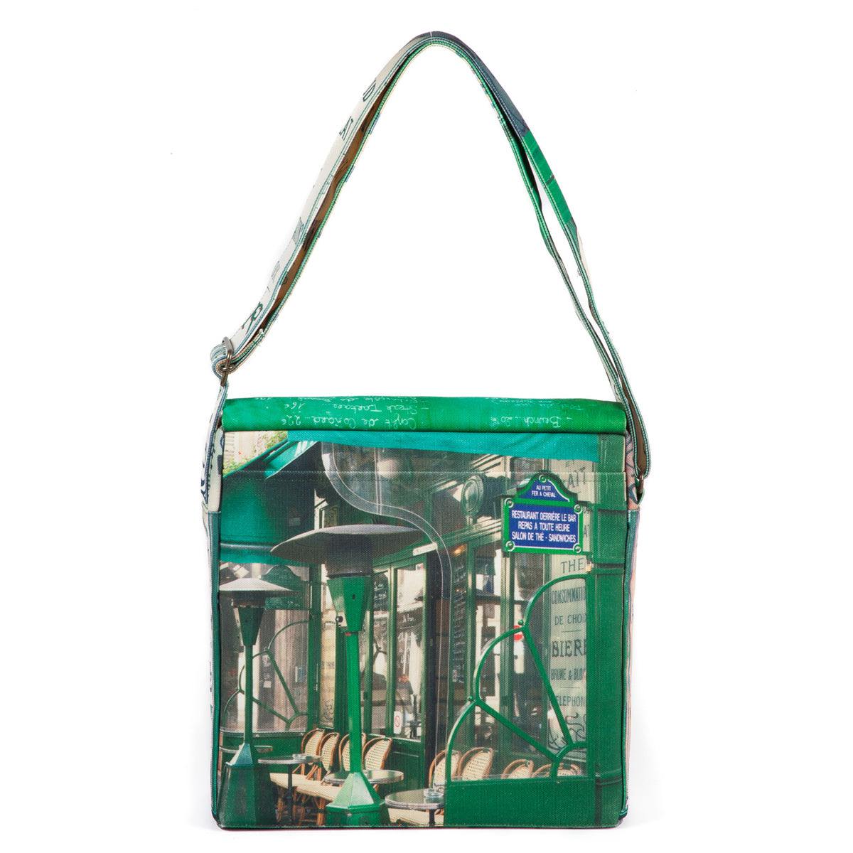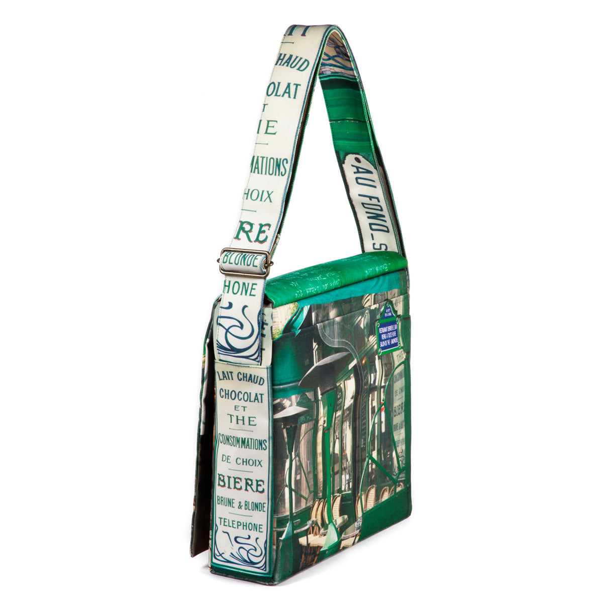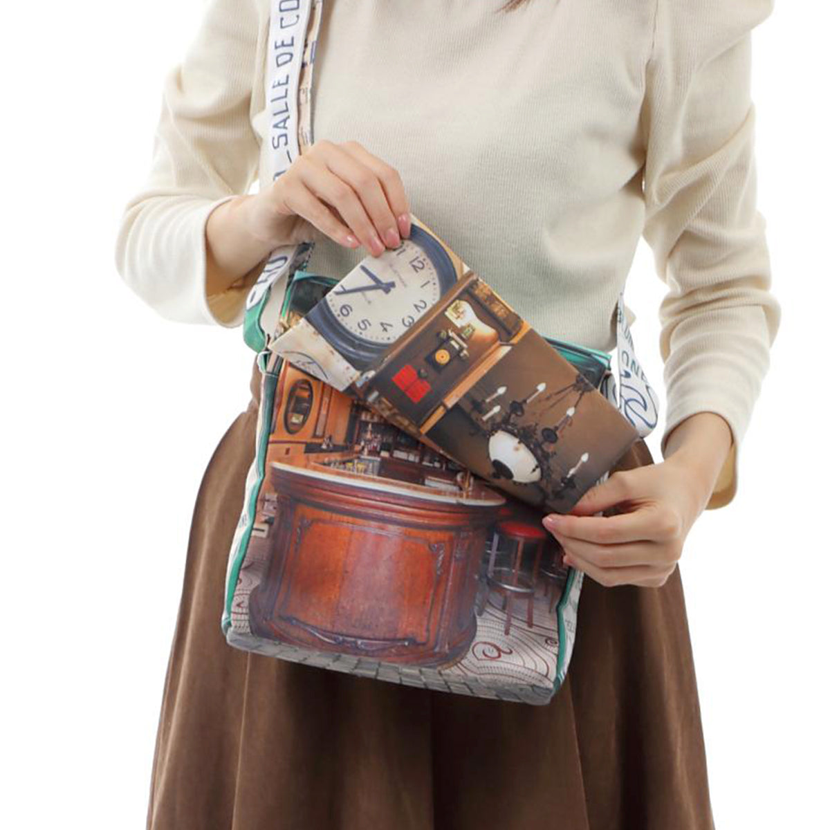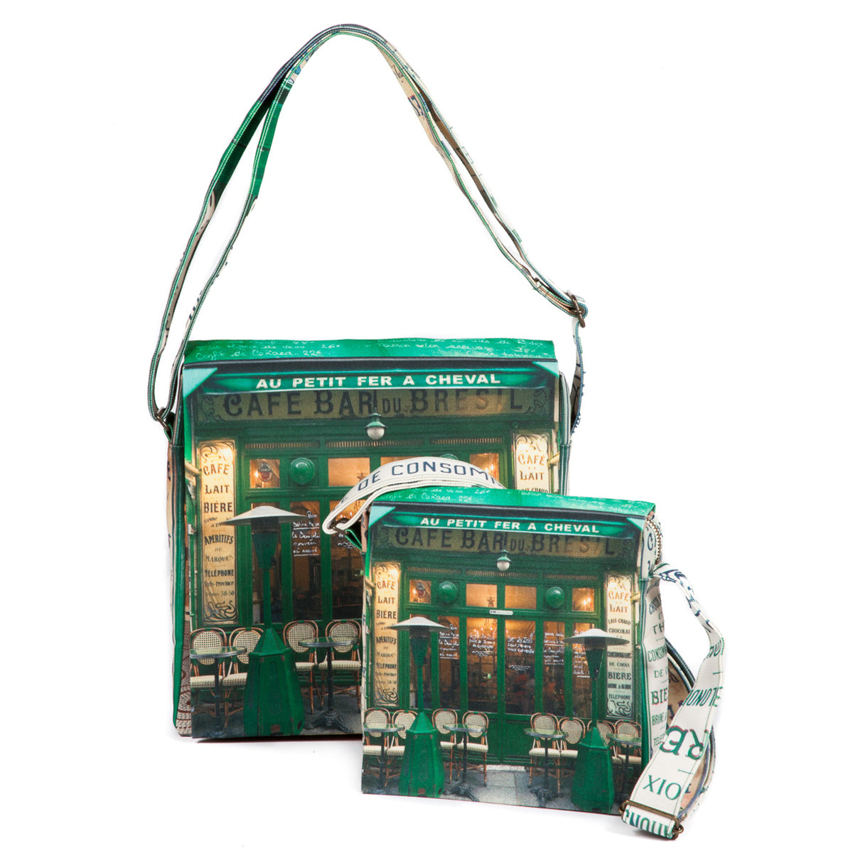 Au petit fer à cheval(プティフーアシュヴァル)は、パリに実在する老舗のカフェ。グリーンが印象的な店構えや、看板、店内をコラージュし、バッグの全面やフラップの内側、幅広の持ち手にもプリントした、おしゃれなショルダーバッグです。