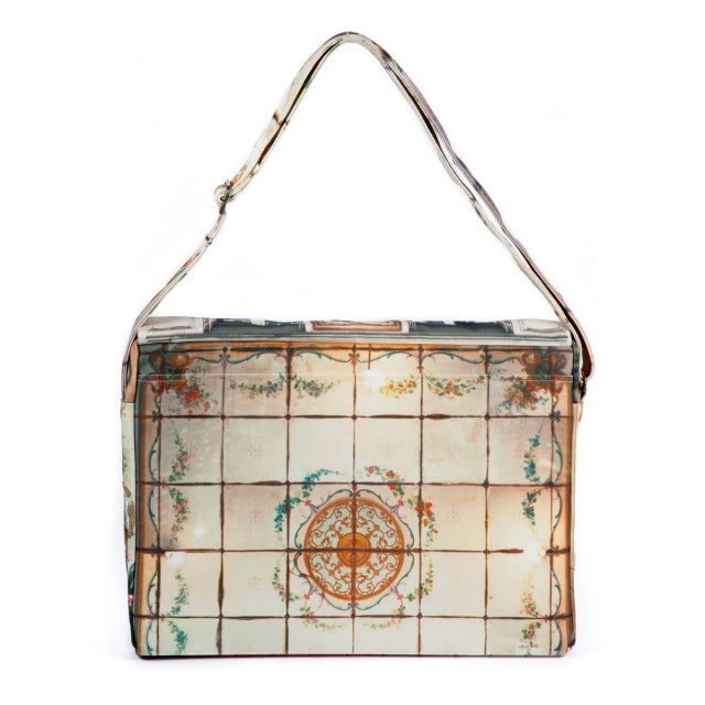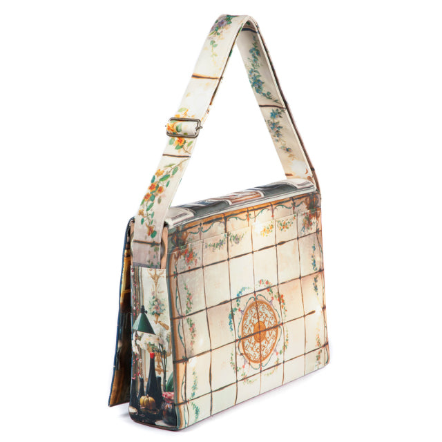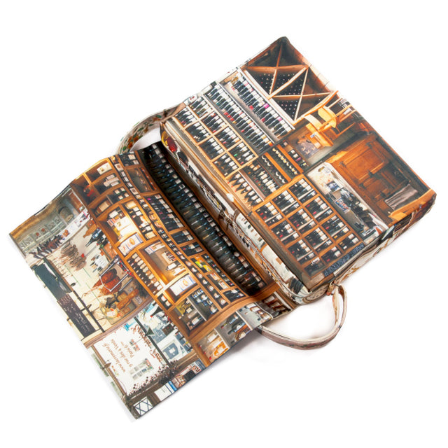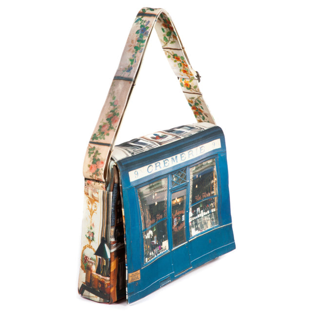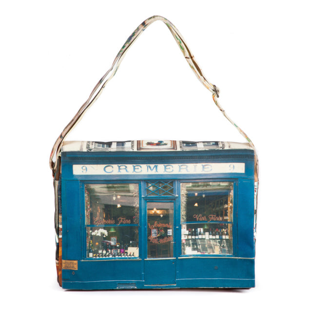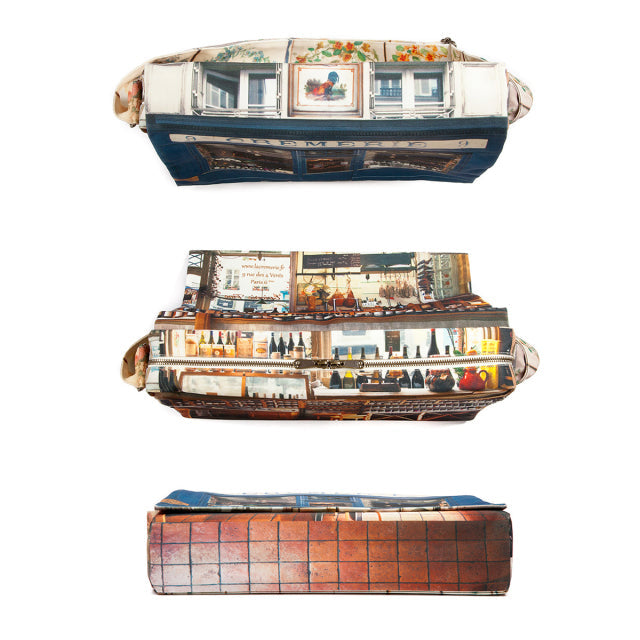 Cremerie(クレムリ)は、パリに実在するワインのお店。ブルーが美しい店構えをバッグの表に。花をあしらった美しい装飾タイルをバッグの裏面とショルダーベルトに。フラップの内側には、ワインボトルが並んだ店内の様子がデザインプリントされています。