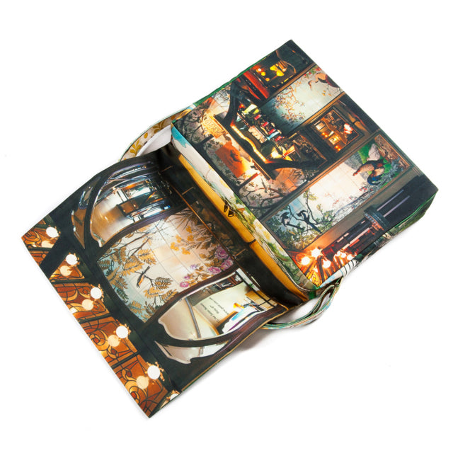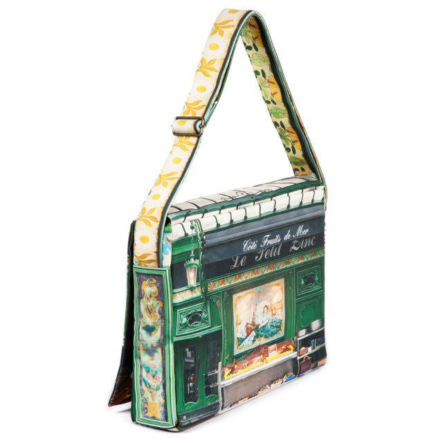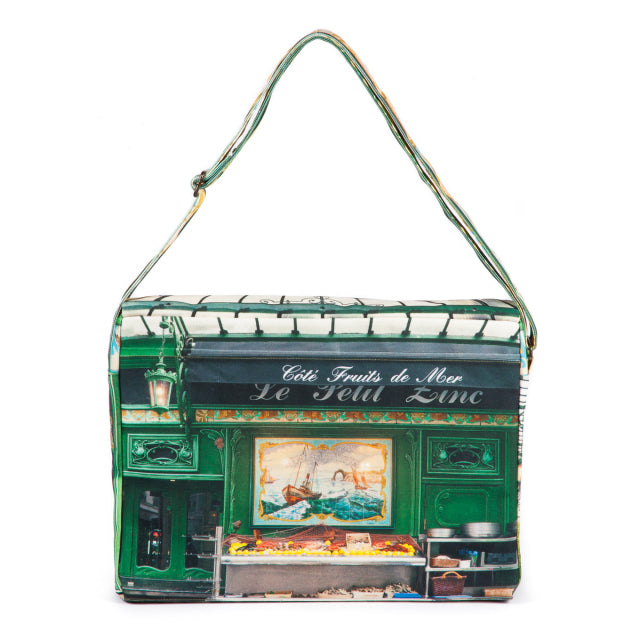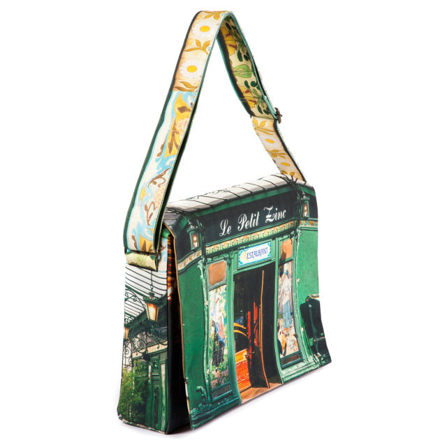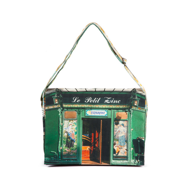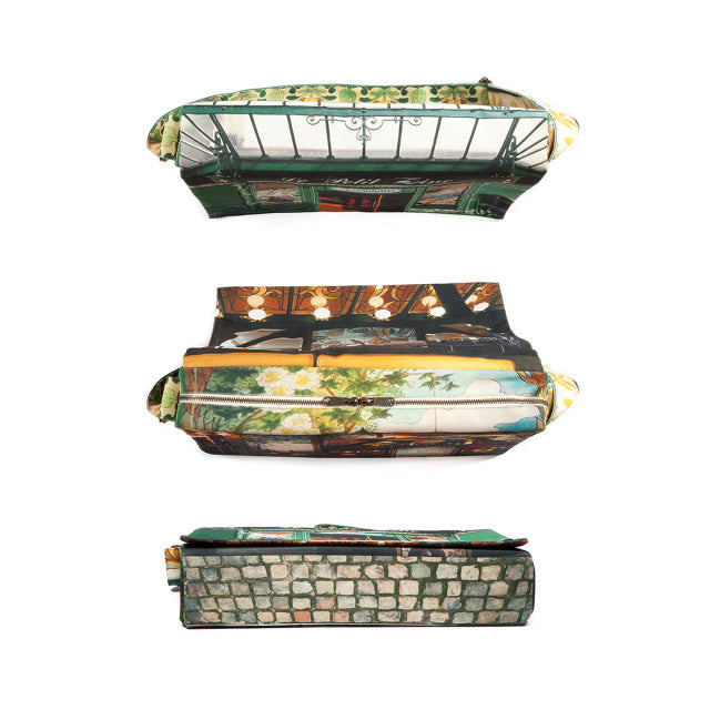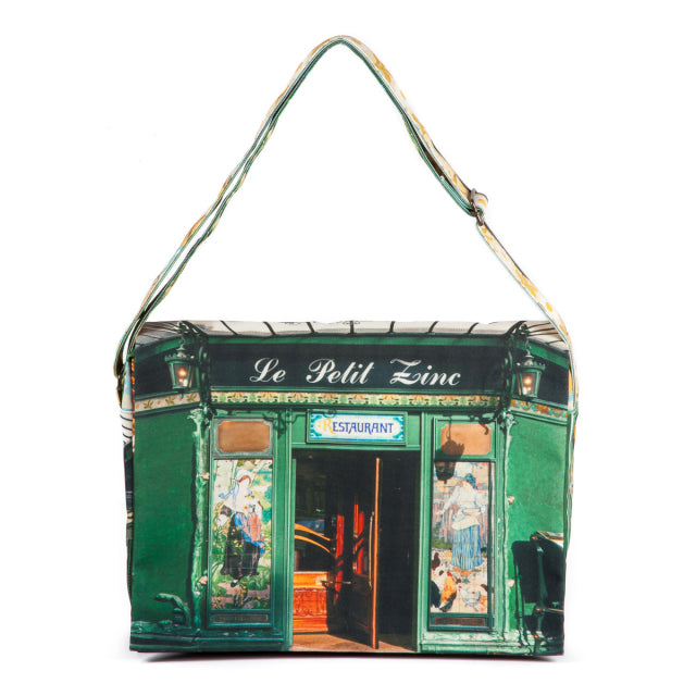 Le petit zinc(プチ・ジン)は、パリに実在するレストラン。鮮やかなグリーンと装飾タイルが美しい店構えをバッグの表に。美しい花をモチーフにした店内装飾をショルダーベルトに。フラップの内側には、店内の様子がデザインプリントされています。