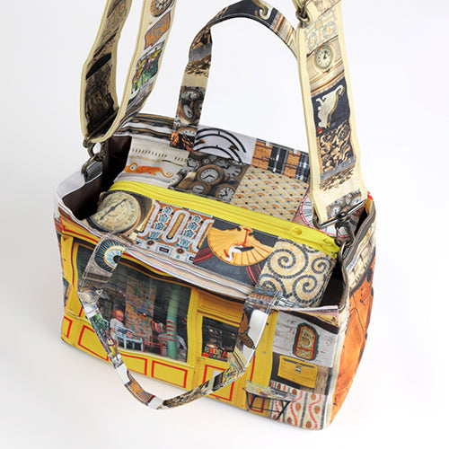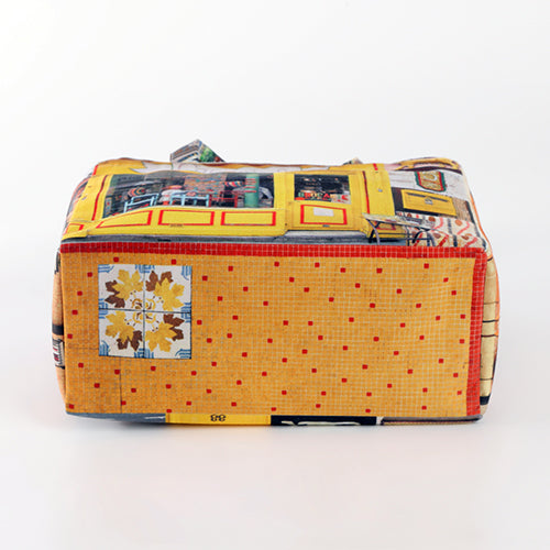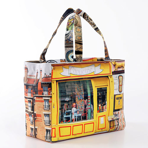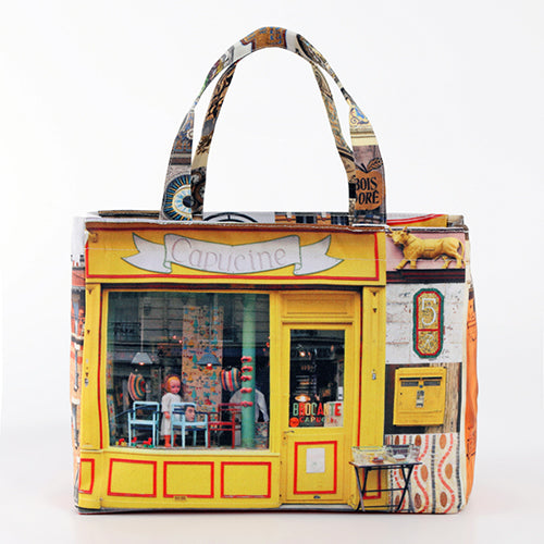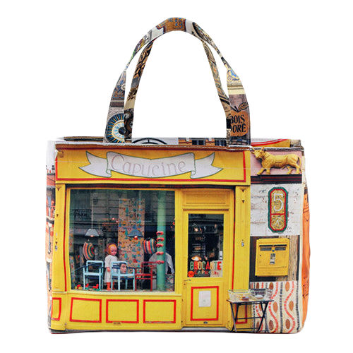 黄色のファサードが一際目立つパリの雑貨屋さんがプリントされたビビッドな色合いが特徴のバッグ。