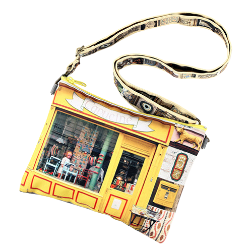 黄色のファサードが一際目立つパリの雑貨屋さんがプリントされたビビッドな色合いが特徴のポシェット。