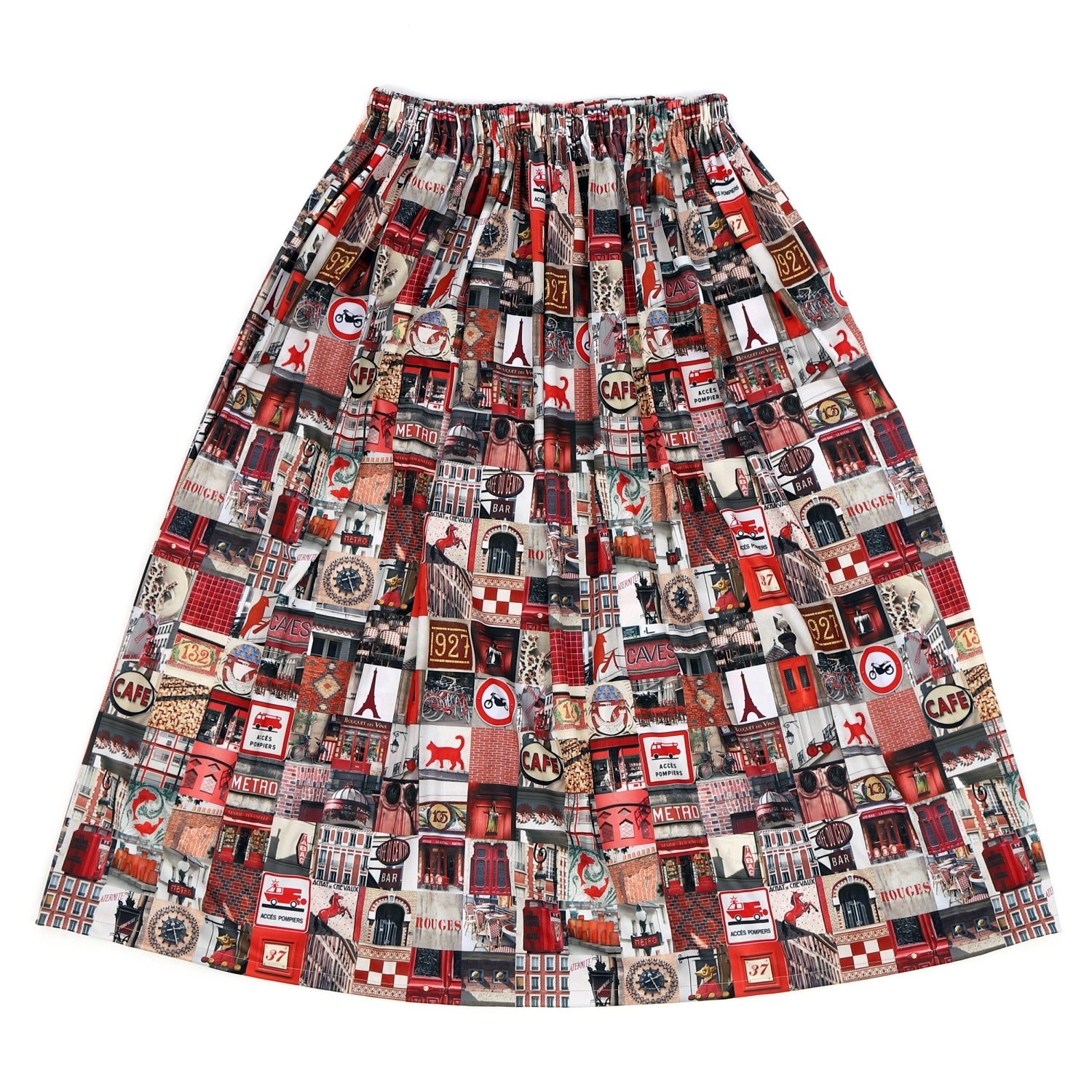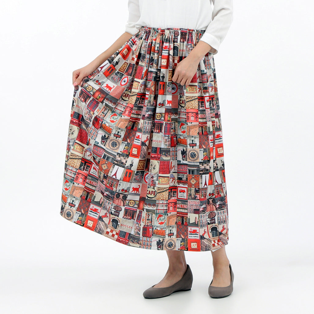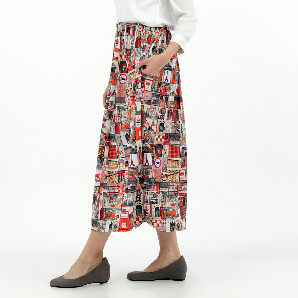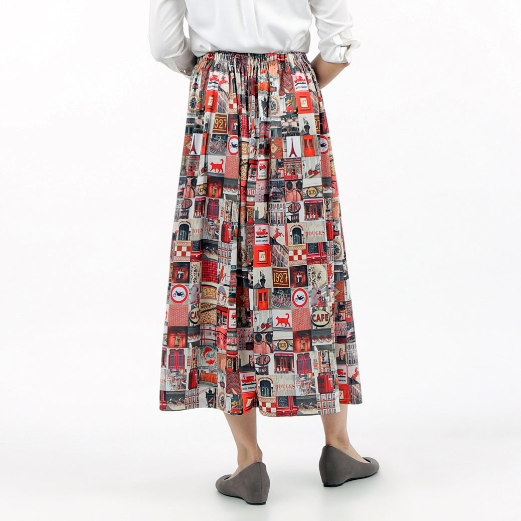 デザイナー「マリー・ブイヨン」がパリの街並みや風景を写真に納め、スカートにプリントを施しました。同じシリーズのパリ・カラーバッグとマチ付きポーチとお揃いの柄。ふんわりと気持ちの良い肌ざわりで履き心地抜群。ウエスト部分はゴム仕様となっているので様々なサイズに対応しています。