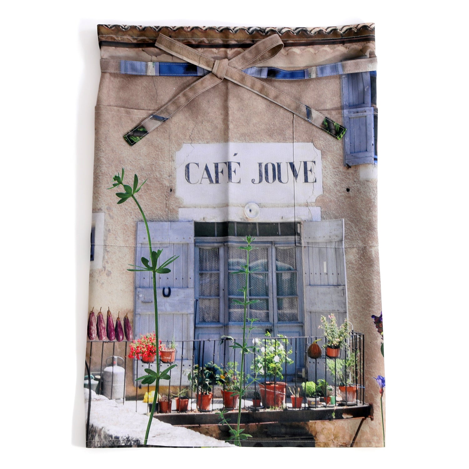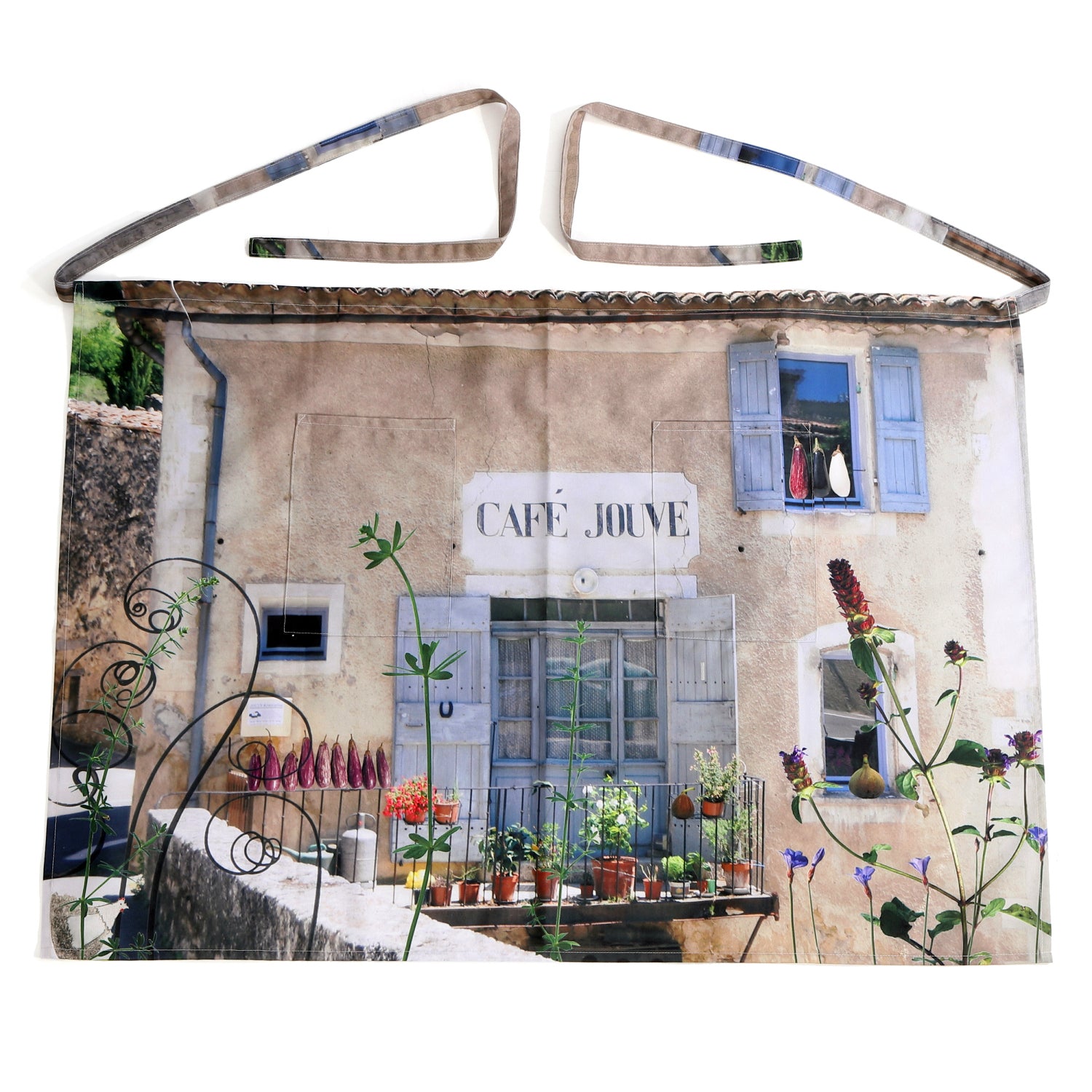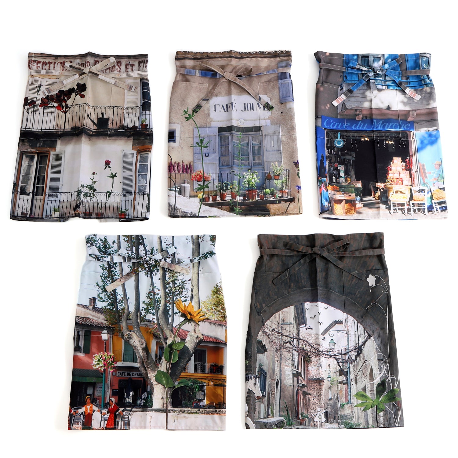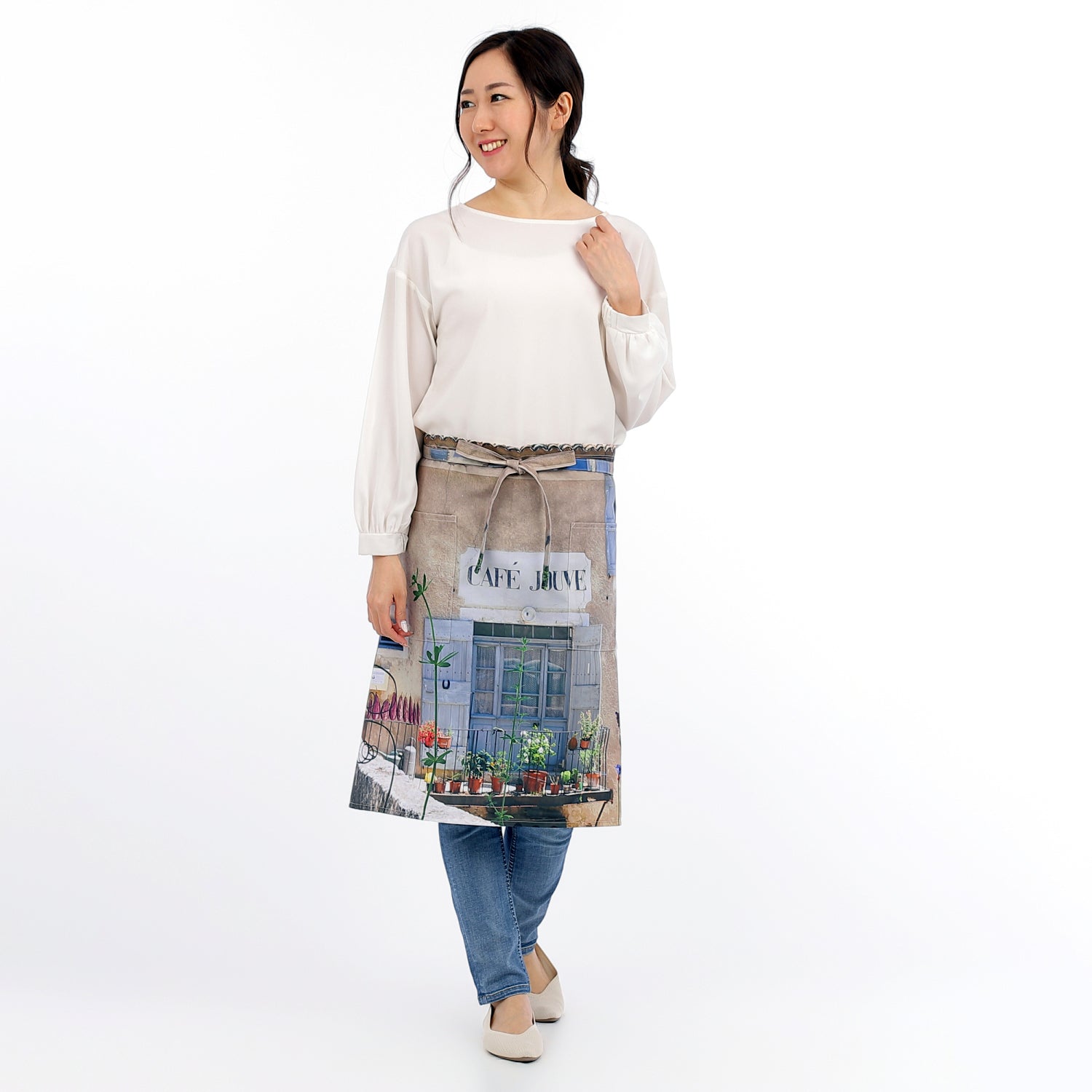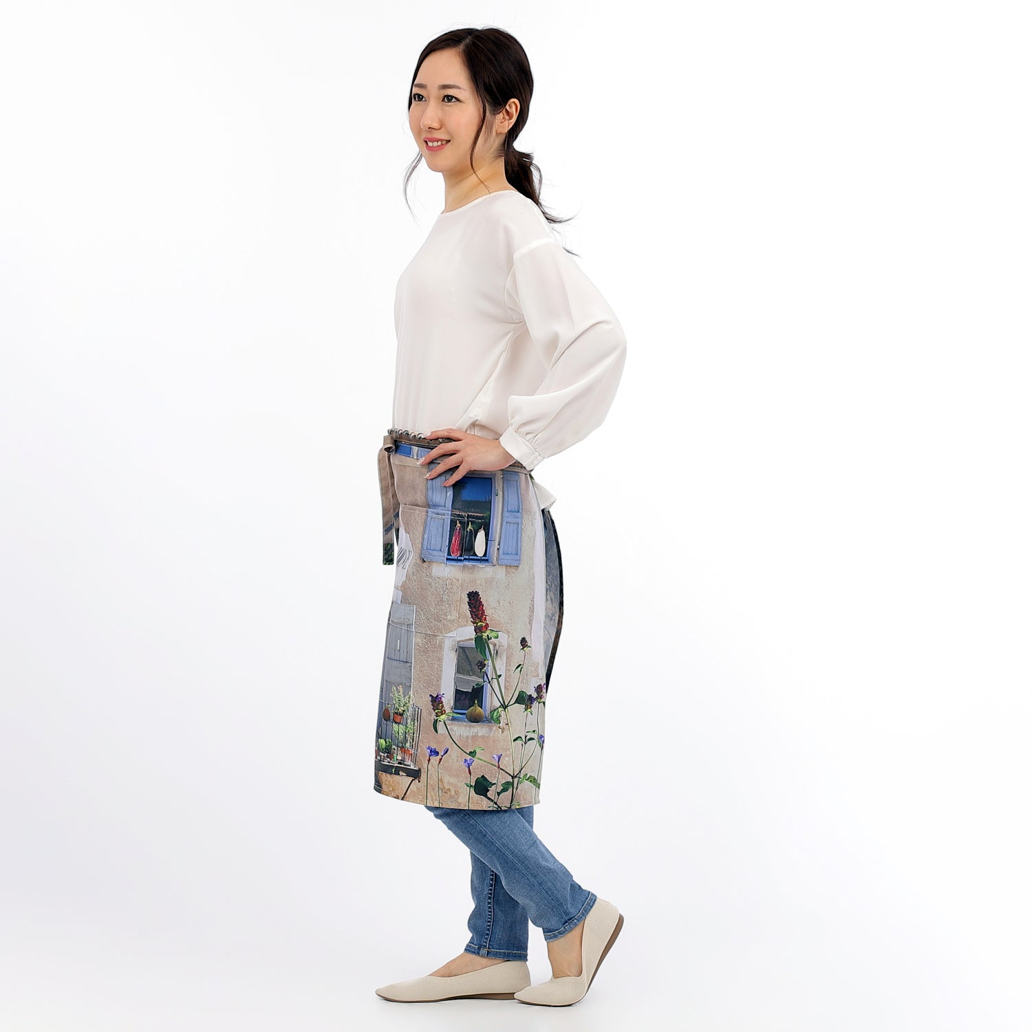 フランス・プロヴァンスの街並みをモチーフにした写真をプリントしたカフェエプロン。洗練されたデザインで、日常にリゾートの雰囲気をプラス。